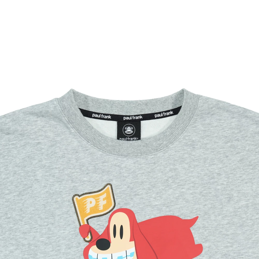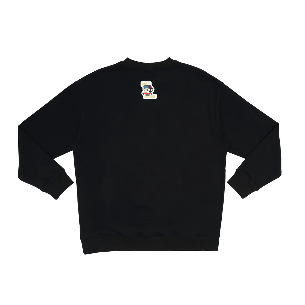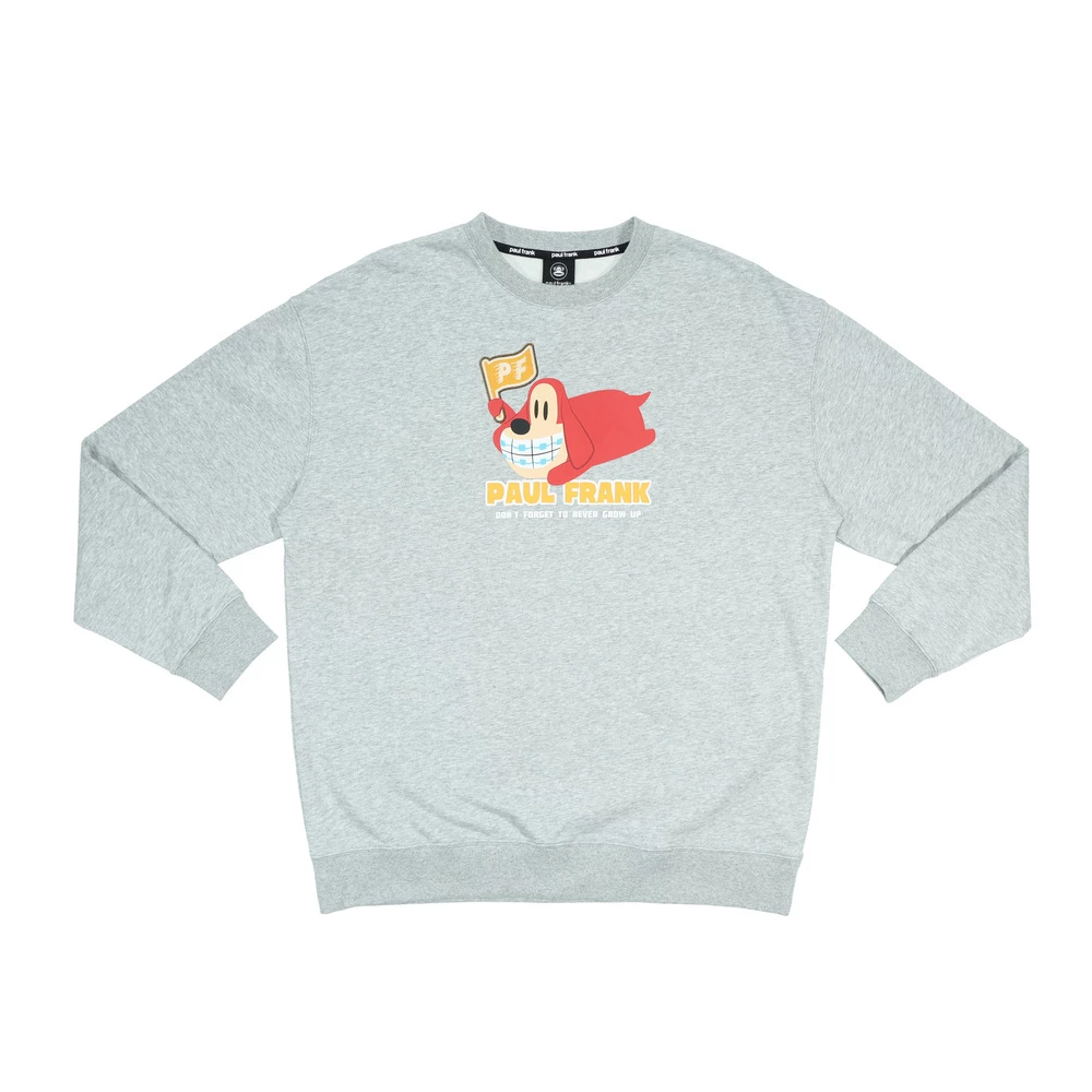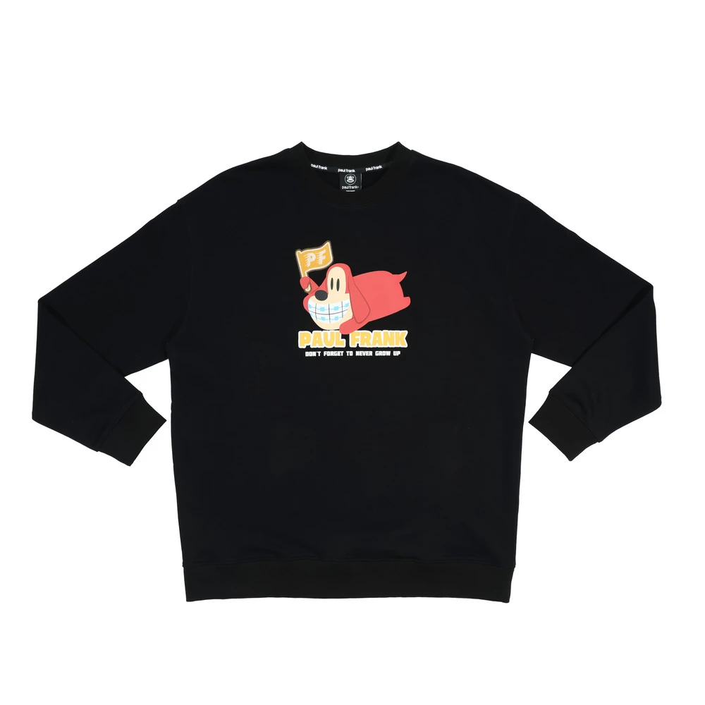 此款經典版型上衣,使用毛圈面料,厚度適中不厚重。 正面為趴臥姿勢的 Bob 印花,手中揮舞著採用特殊工藝製作的 PF 旗幟,呈現出一種慵懶卻又想努力的趣味氛圍。 背面繡有戴帽造型的 Julius 布標,整體風格可愛俏皮,充滿童趣與個性。