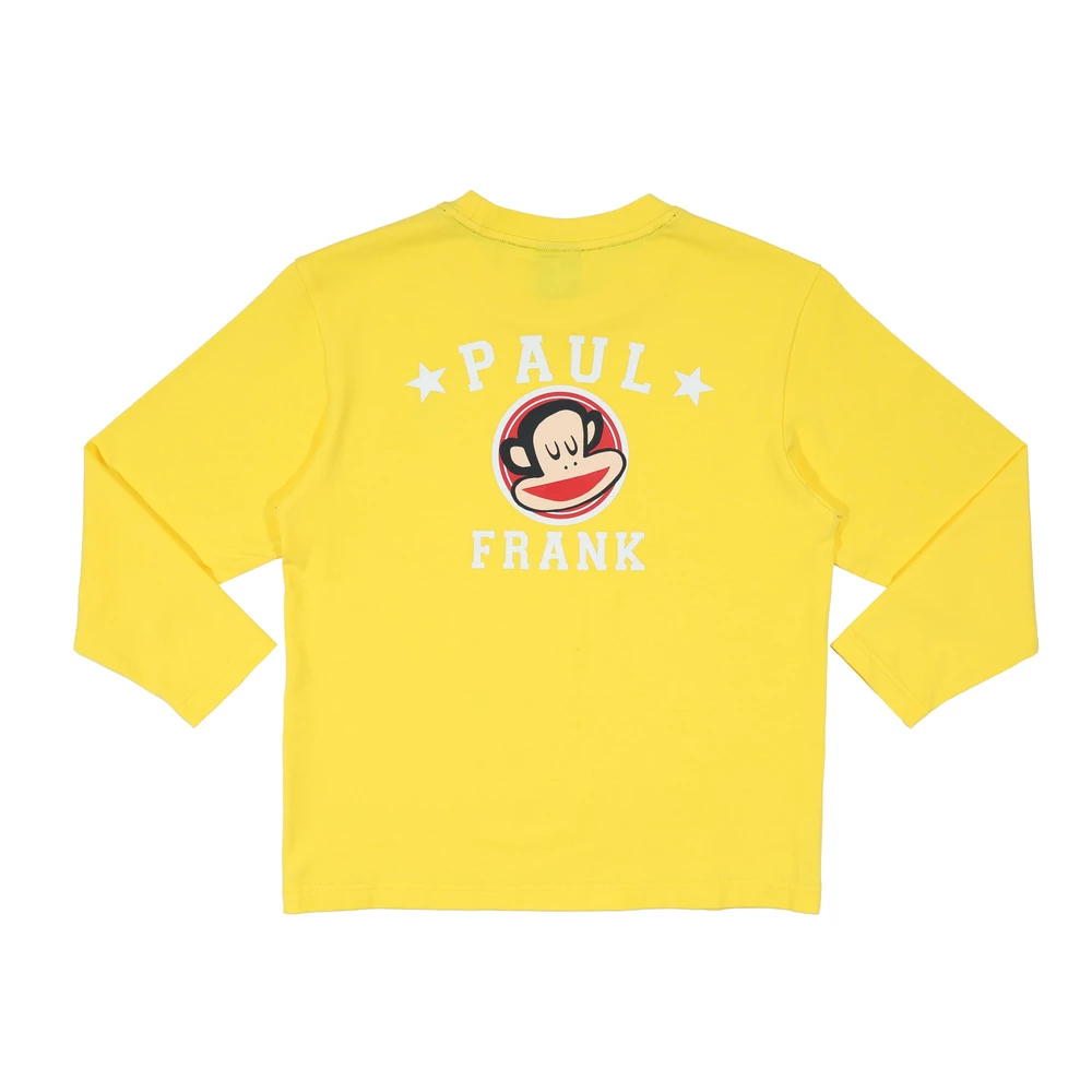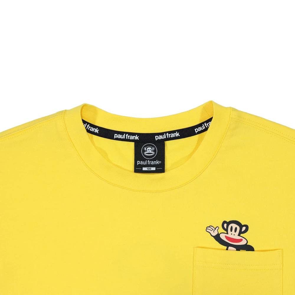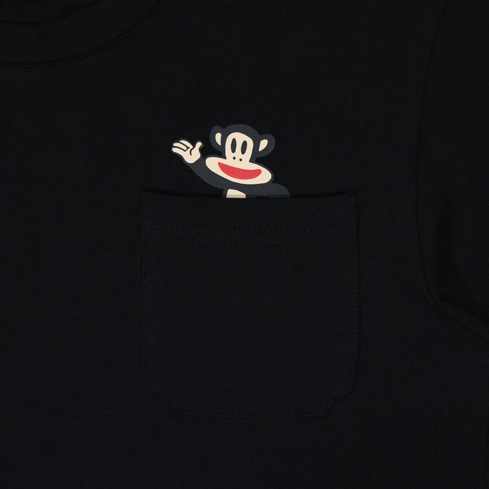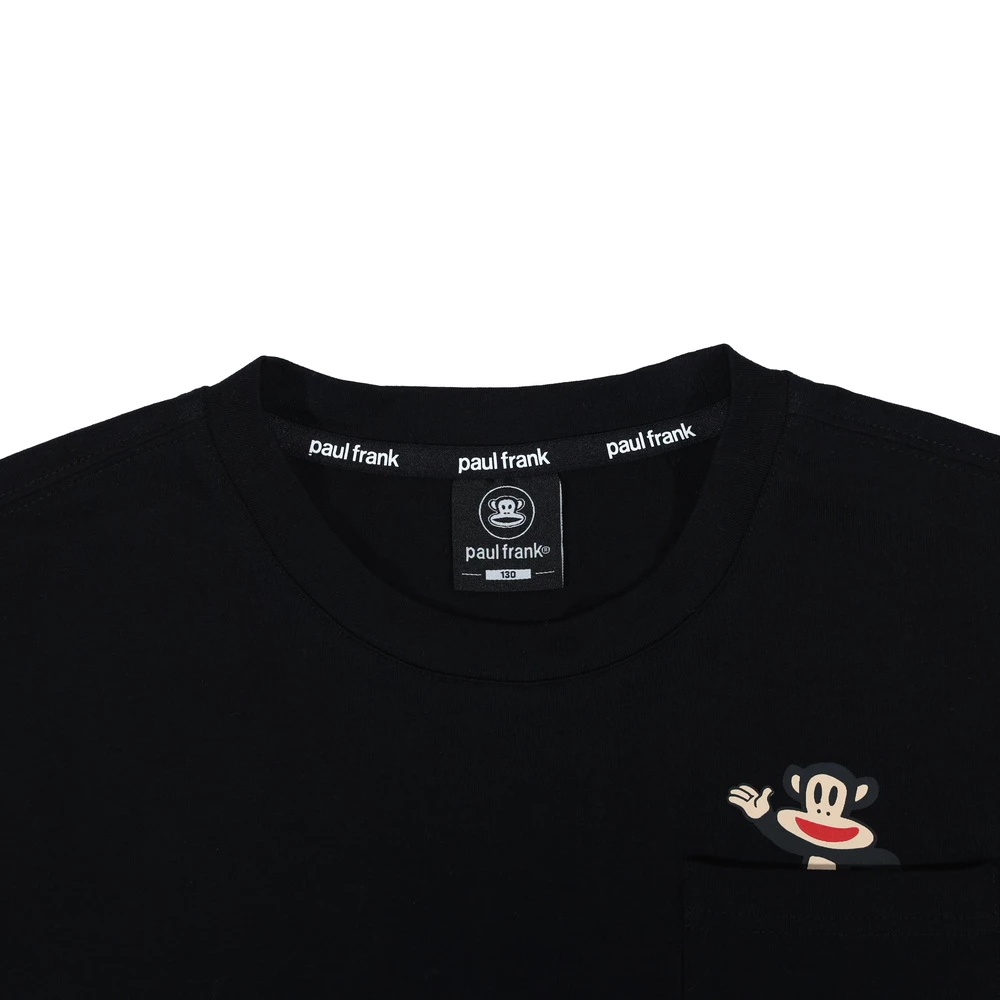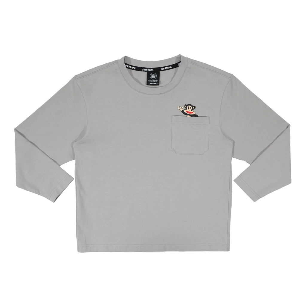 此款薄長袖T恤,使用帶點彈性的薄面料,穿著舒適,左胸前口袋中露出的 Julius 招手印花與背面大圖 Julius 印花,展現出趣味朝氣風格。