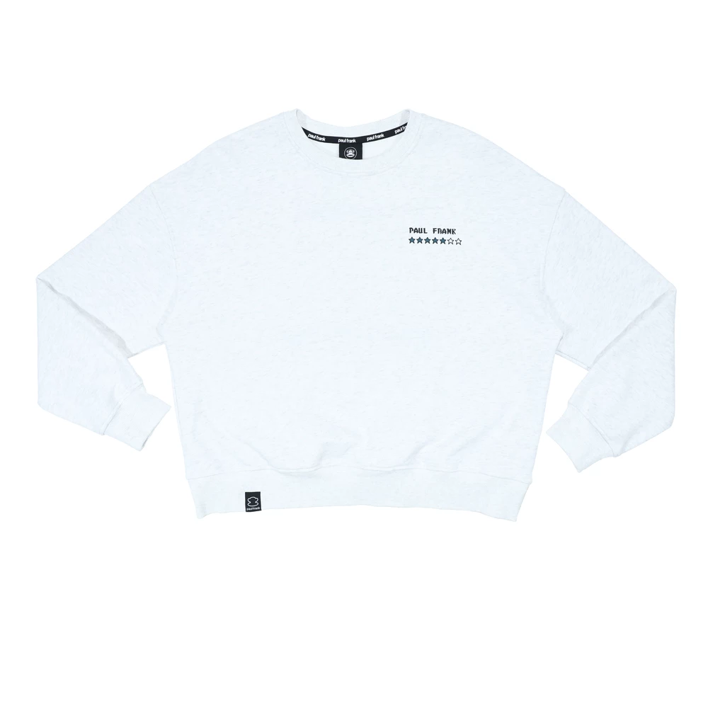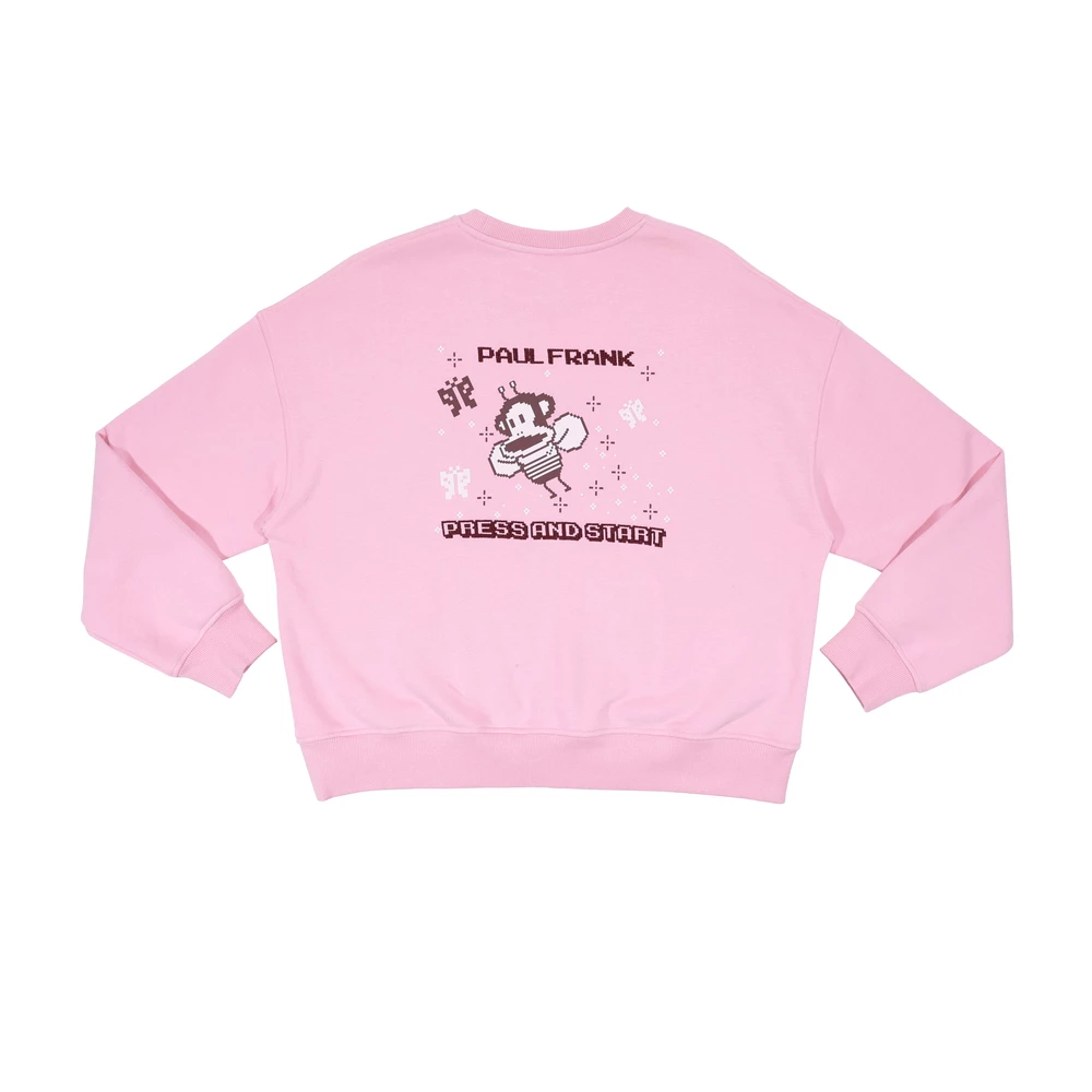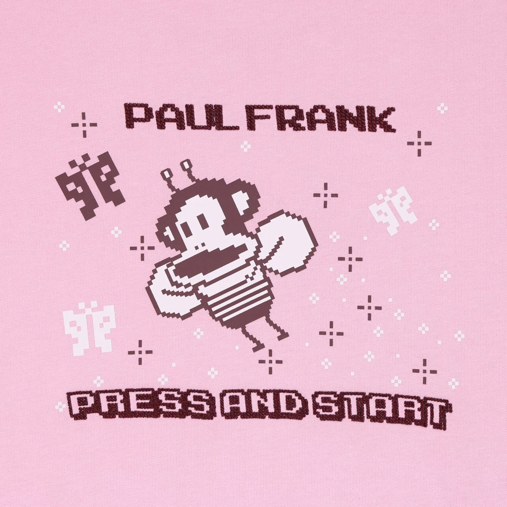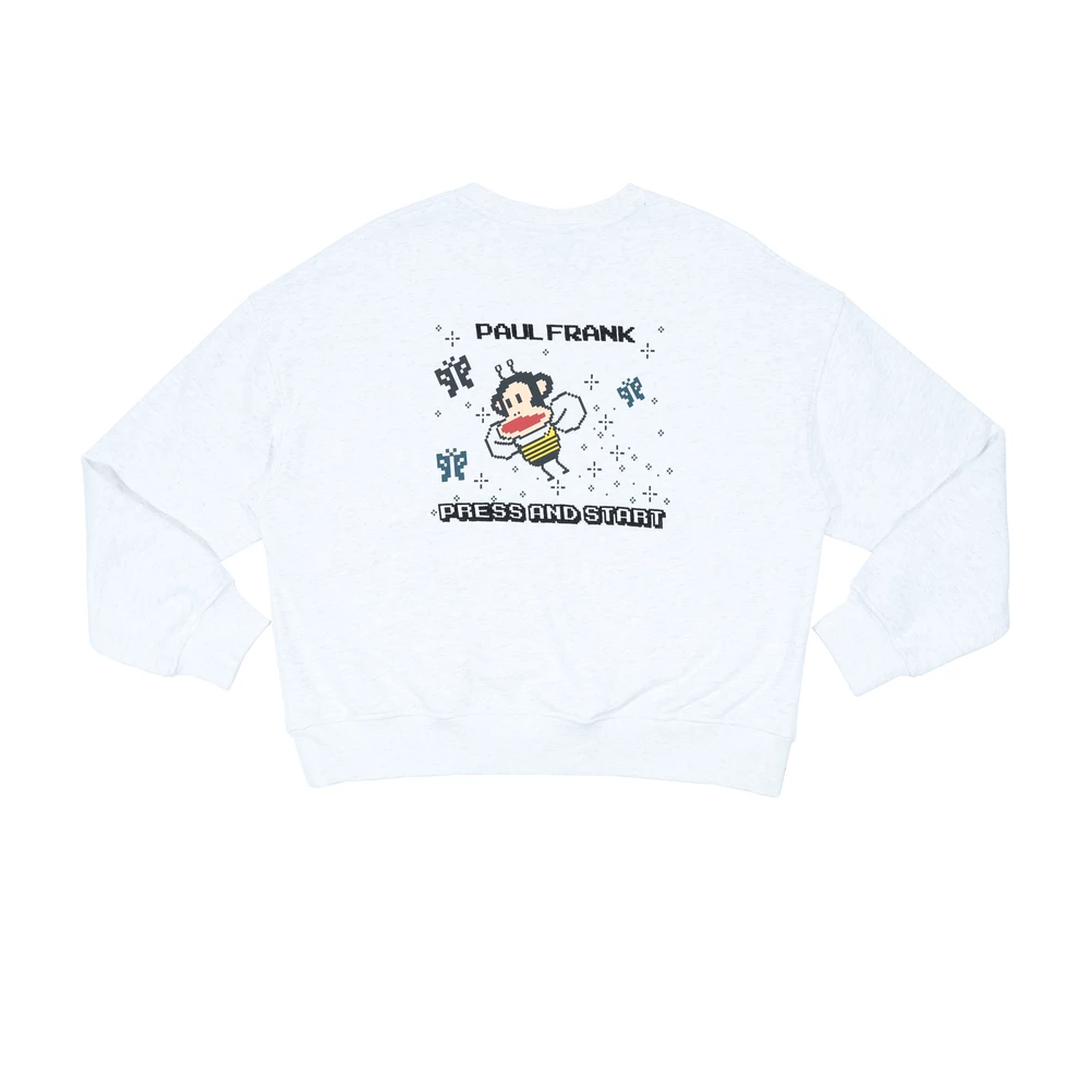 短版寬鬆版型,使用厚毛圈面料,布面磨毛觸感,刷毛保暖舒適。 正面點綴小型像素印花,背面以 Julius 蜜蜂像素圖與方格繡花結合,營造 2-bit 遊戲畫面般的療育童趣感。
