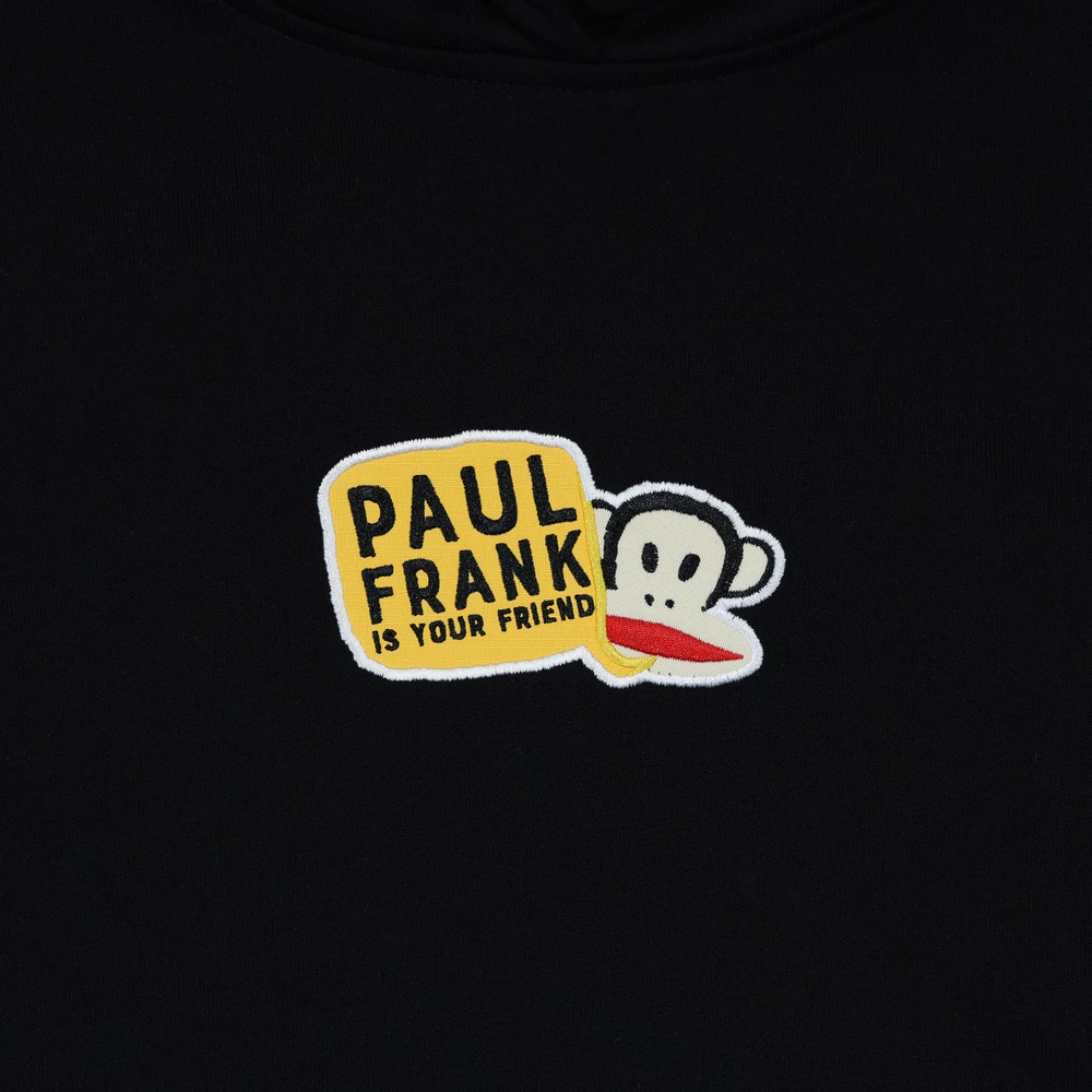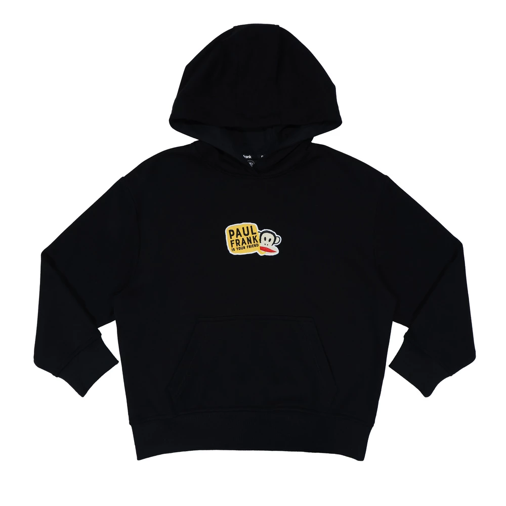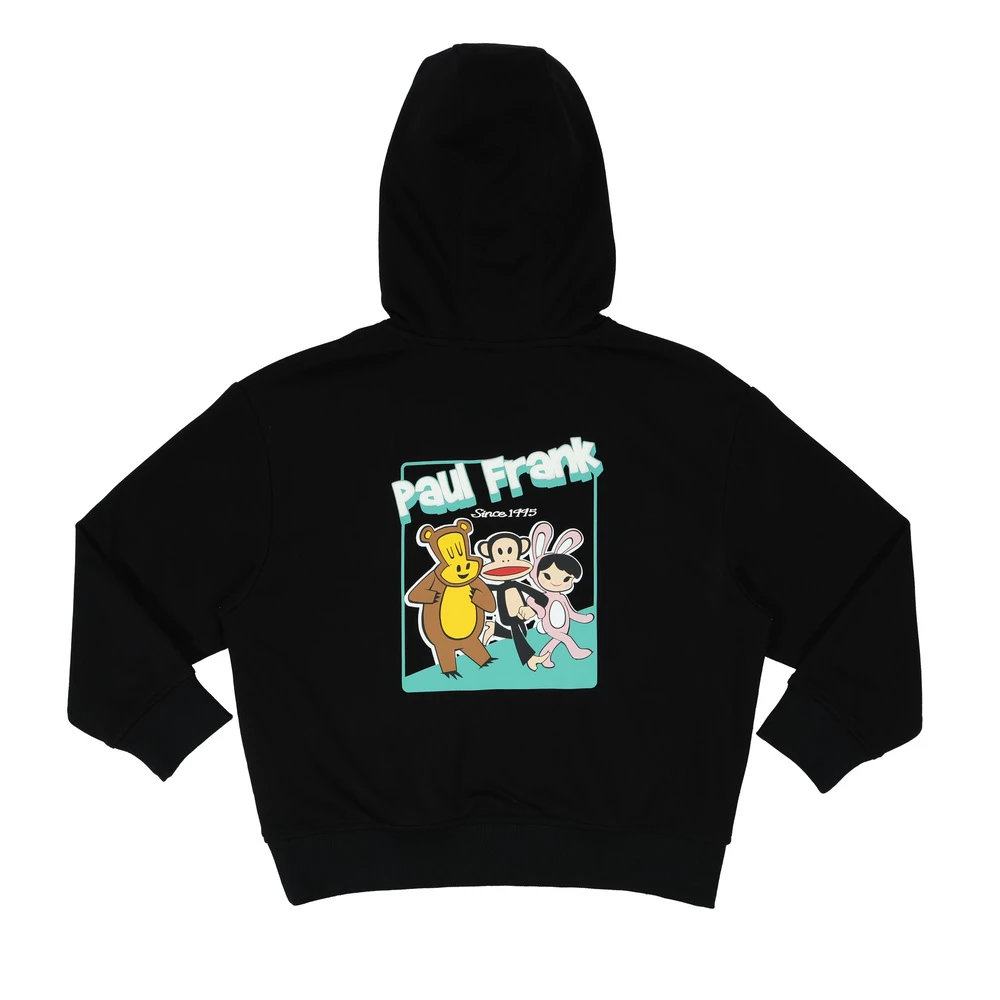 此款帽T使用毛圈面料,厚度適中不厚重。正面為 Julius 對話框繡花,圖案精緻,背面的Julius 朋友大圖,呈現趣味活力感吸引大家的目光!