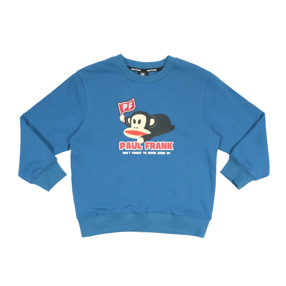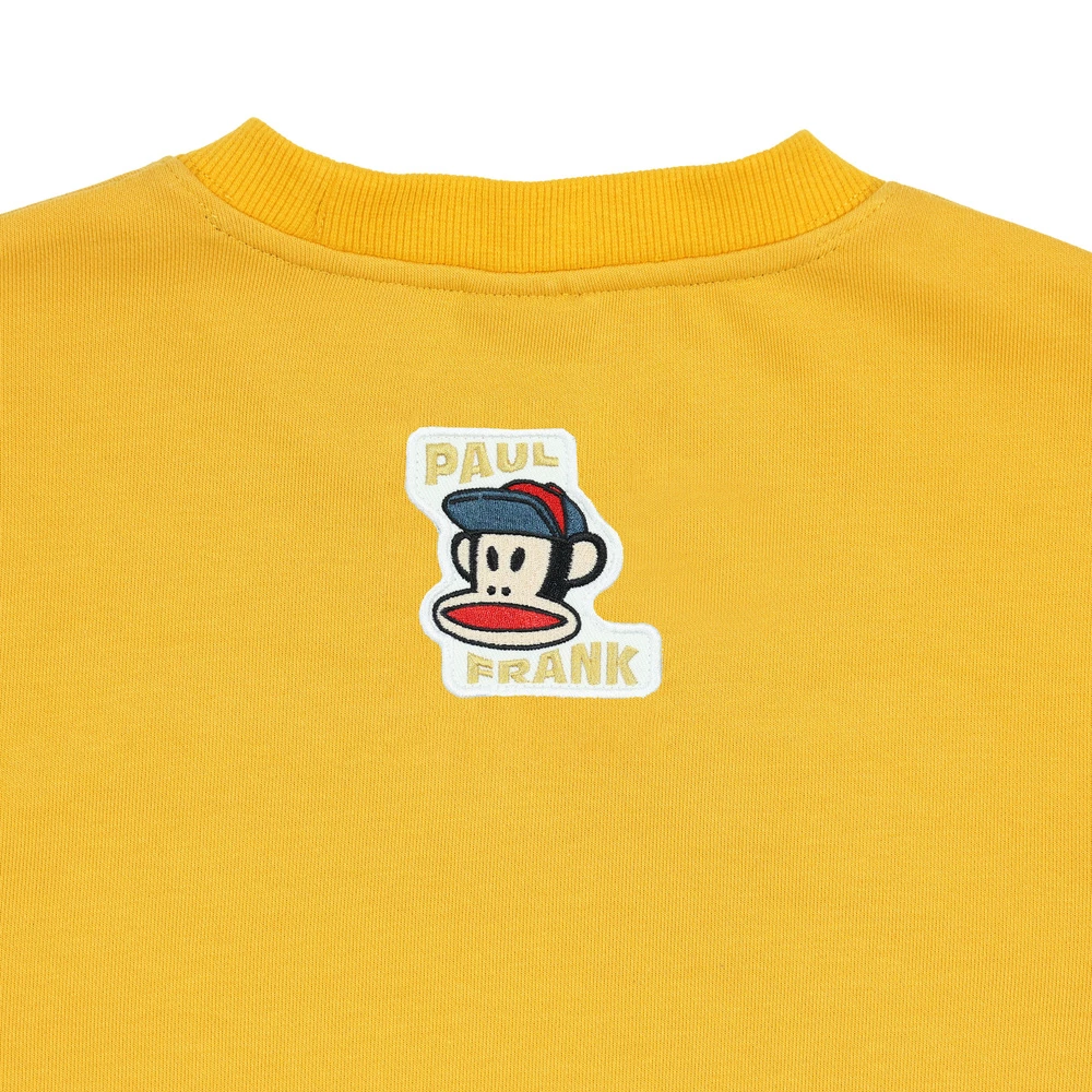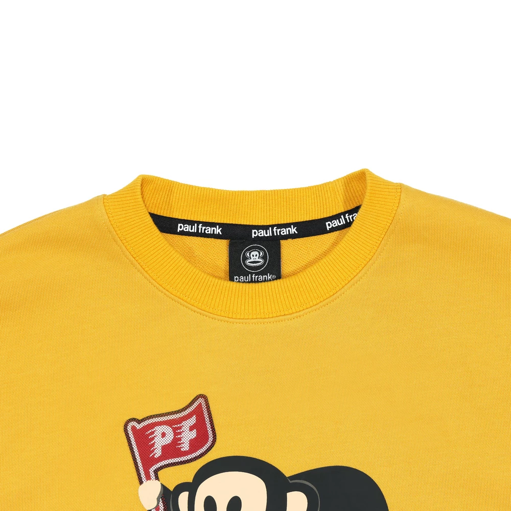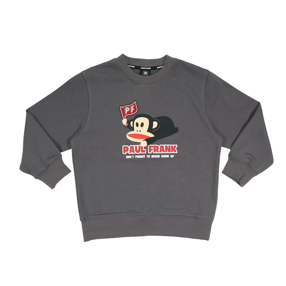 此款經典版型上衣,使用毛圈面料,厚度適中不厚重。 正面為趴臥姿勢的 Julius 印花,手中揮舞著採用特殊工藝製作的 PF 旗幟,呈現出一種慵懶卻又想努力的趣味氛圍。 背面繡有戴帽造型的 Julius 布標,整體風格可愛俏皮,充滿童趣與個性。 此款亦推出大人尺寸,作為親子裝超適合!