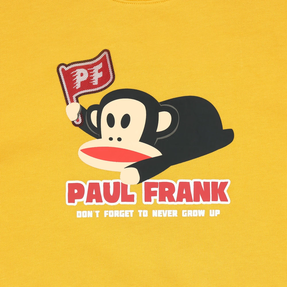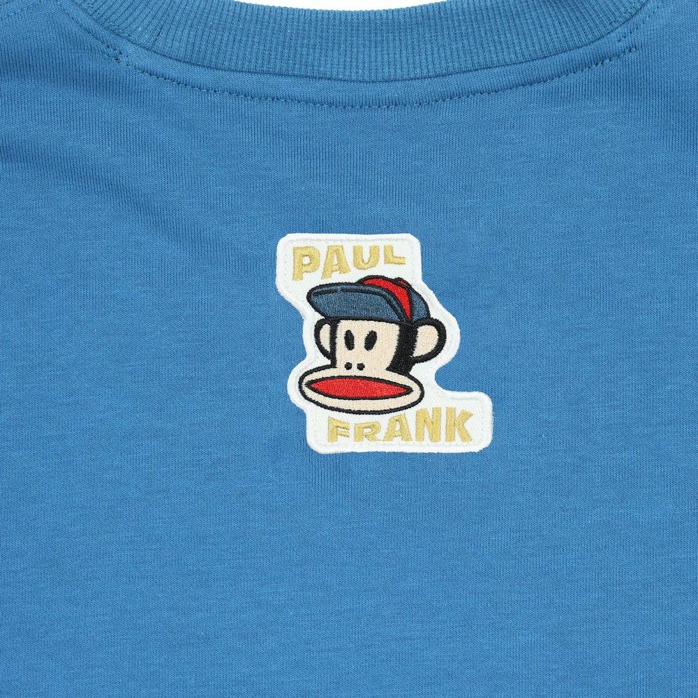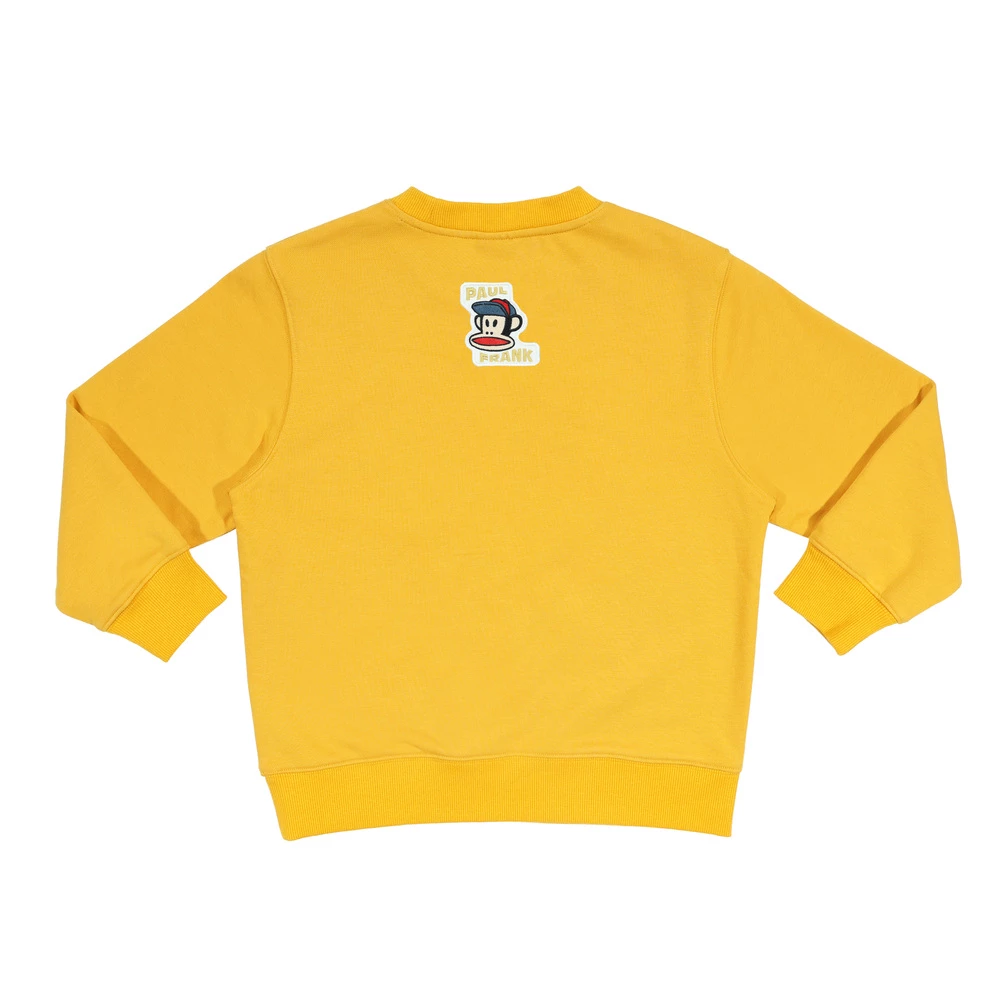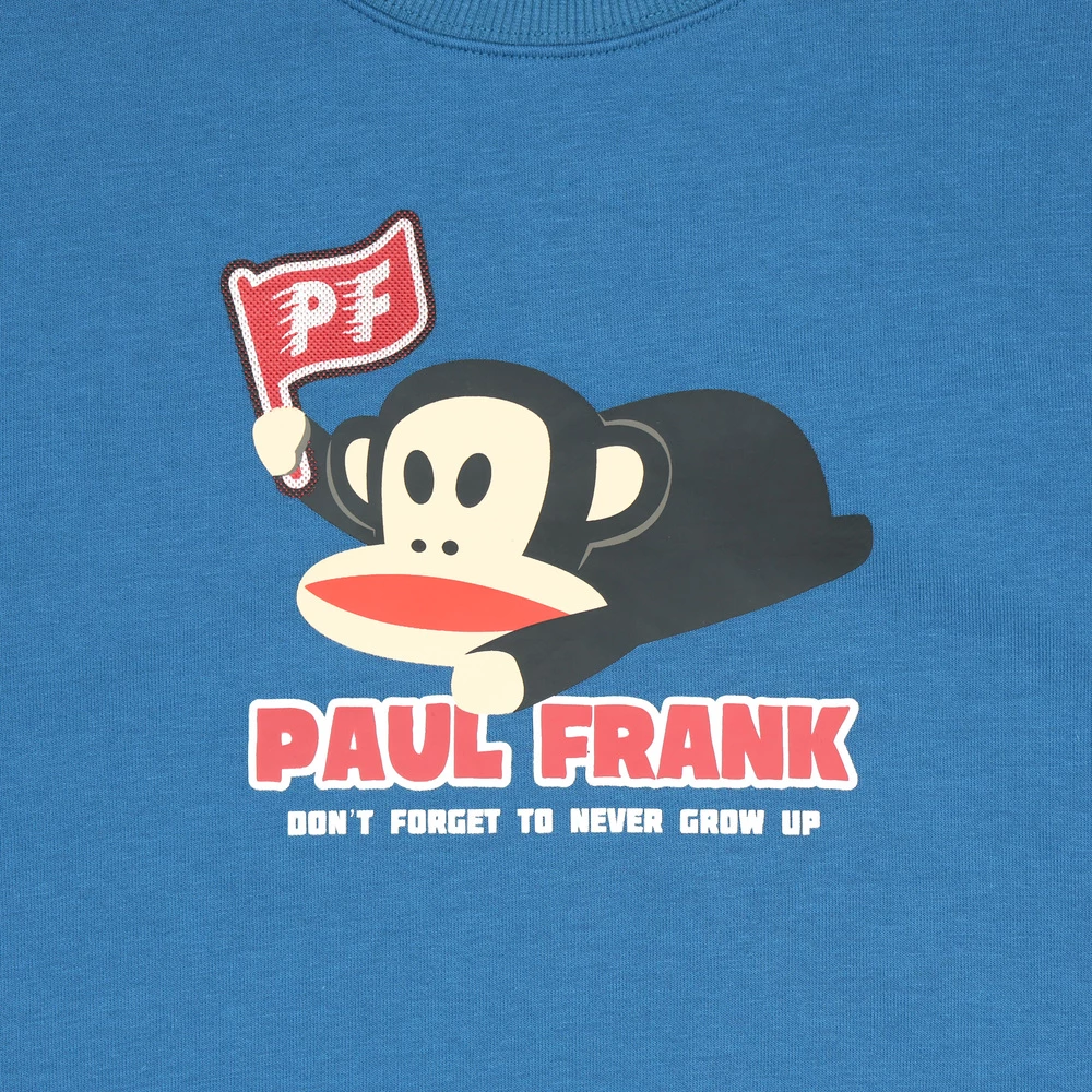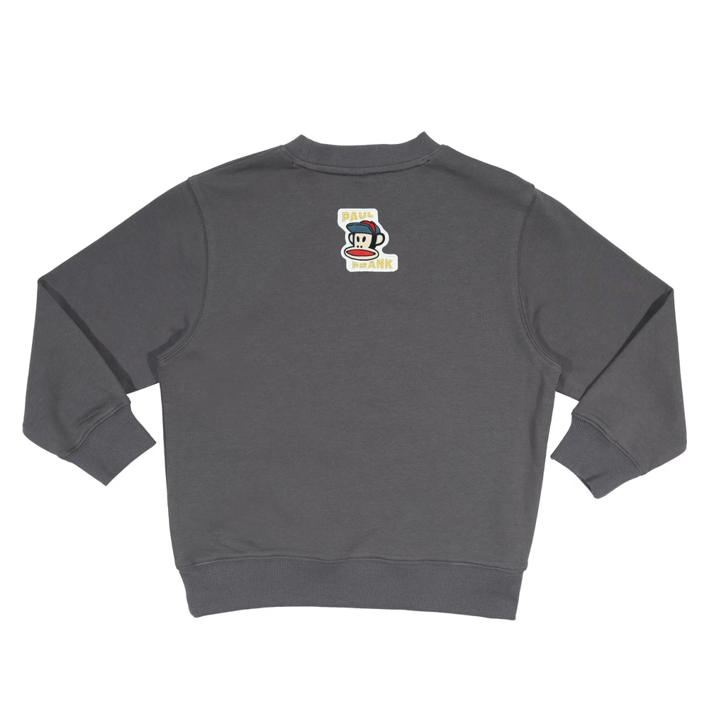 此款經典版型上衣,使用毛圈面料,厚度適中不厚重。 正面為趴臥姿勢的 Julius 印花,手中揮舞著採用特殊工藝製作的 PF 旗幟,呈現出一種慵懶卻又想努力的趣味氛圍。 背面繡有戴帽造型的 Julius 布標,整體風格可愛俏皮,充滿童趣與個性。 此款亦推出大人尺寸,作為親子裝超適合!