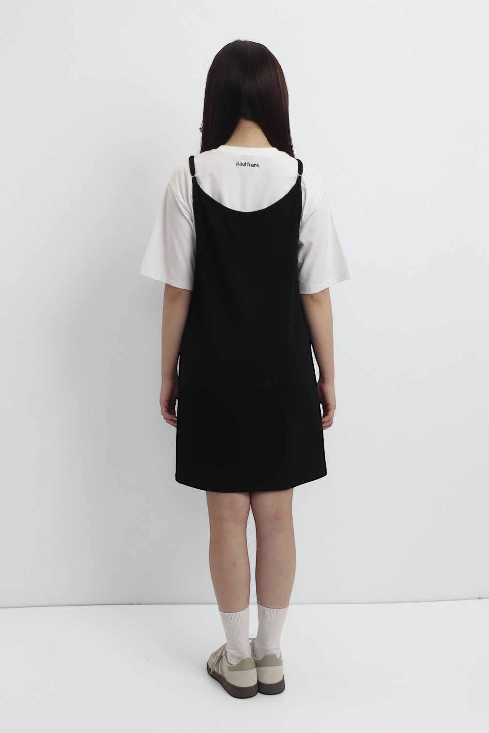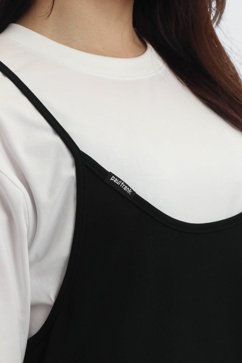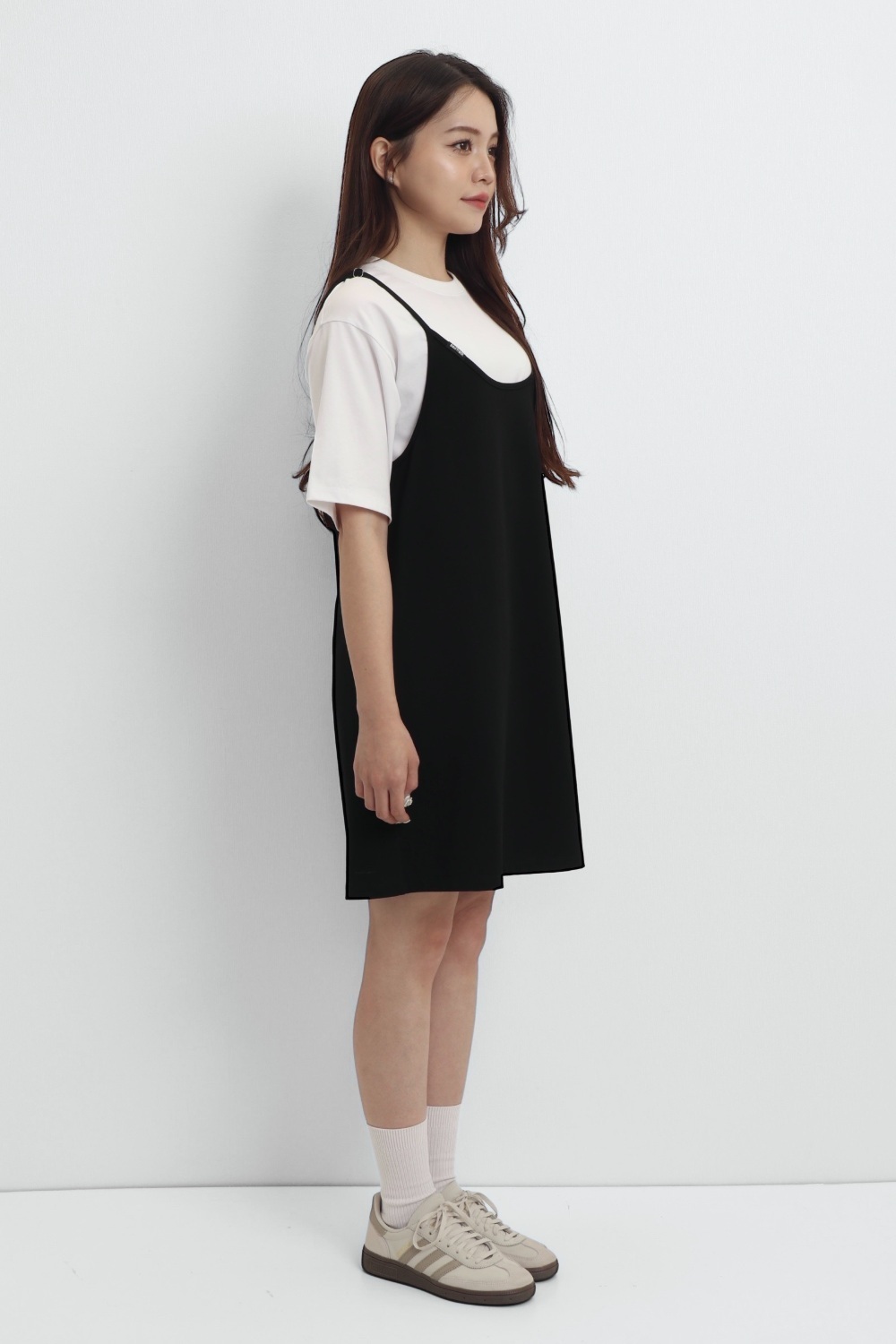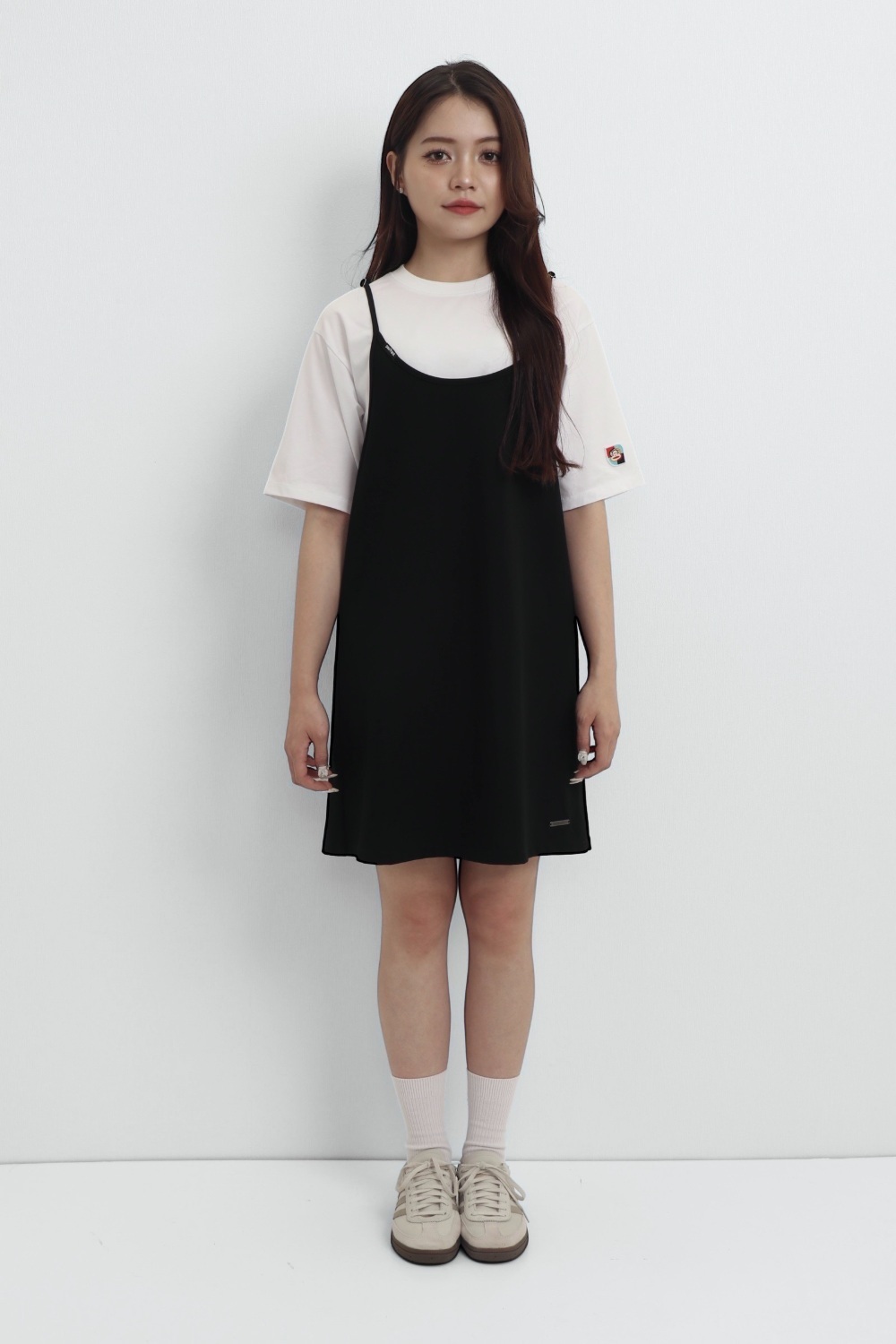 兩件式吊帶裙材質為舒適感的彈性棉質,就是「上衣+吊帶裙」的組合!
