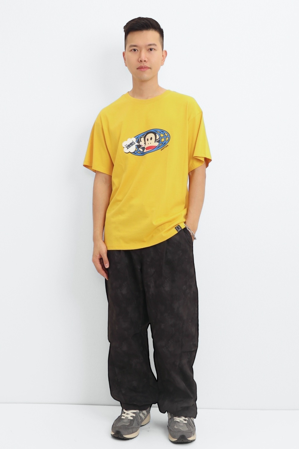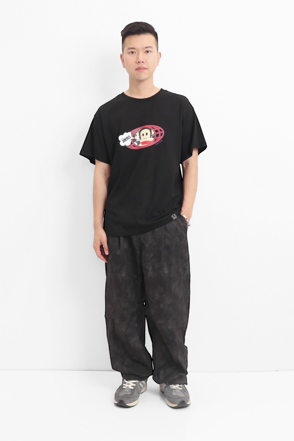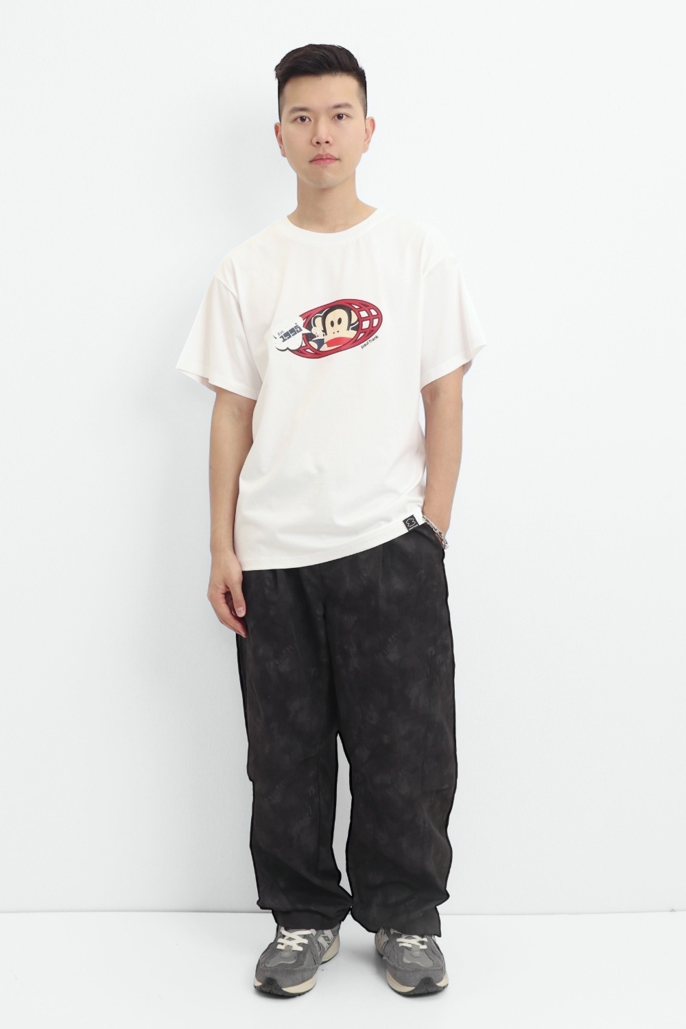 整件以印花 圖案為基底,正面印上大活潑有趣的橢圓形JULIUS噴漆圖,色彩對比鮮明,展現活力與個性。