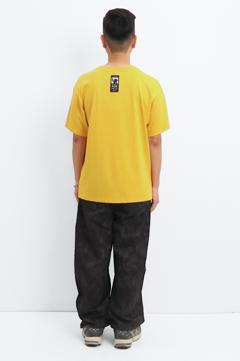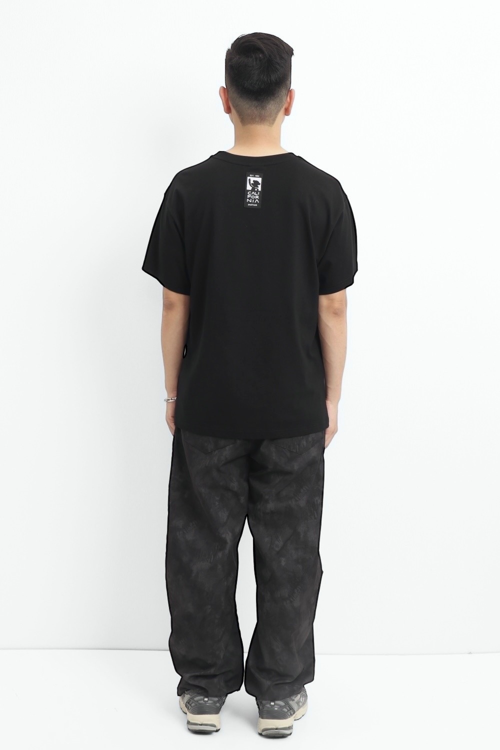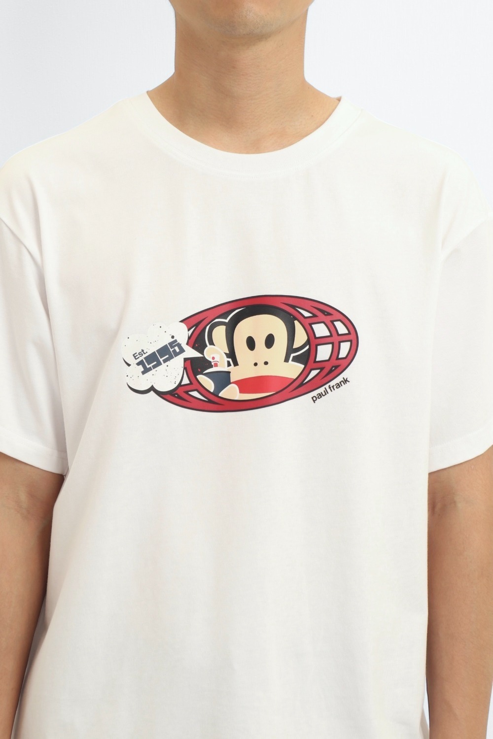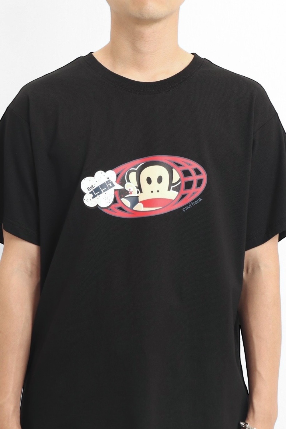 整件以印花 圖案為基底,正面印上大活潑有趣的橢圓形JULIUS噴漆圖,色彩對比鮮明,展現活力與個性。