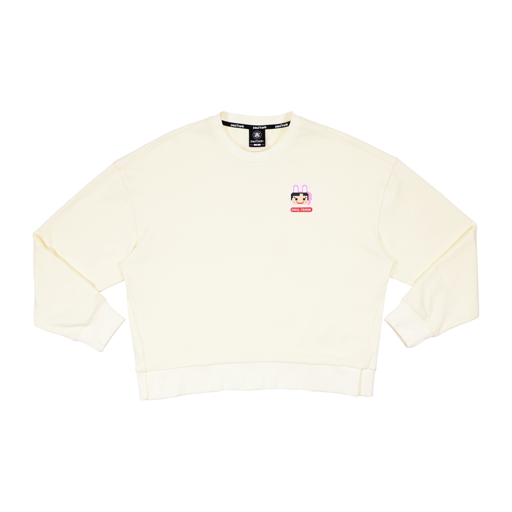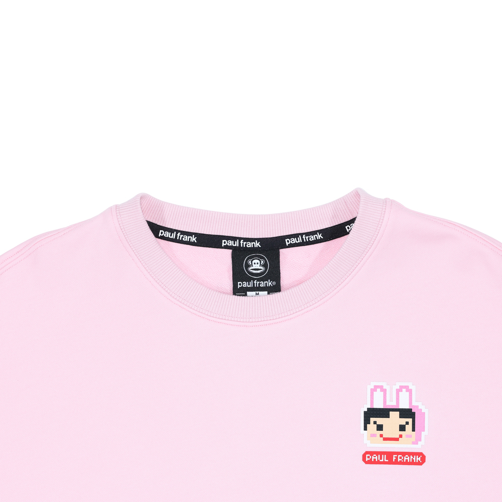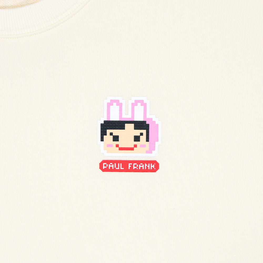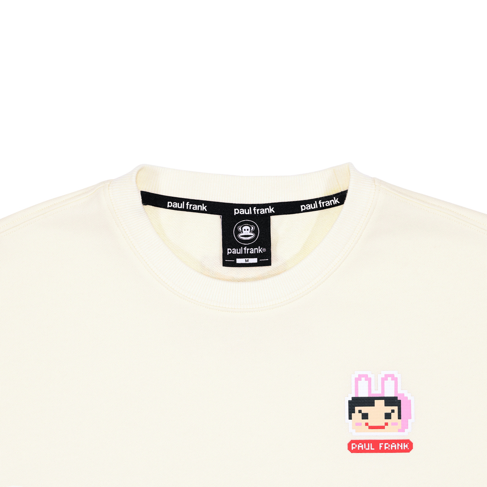 短版寬鬆版型,使用毛圈面料,厚度適中不厚重。以 2-bit 像素遊戲風格為主題,正面印有 Bunny Girl 像素立體印花,背面則為 Julius 像素電玩圖案,整體設計復古又趣味。