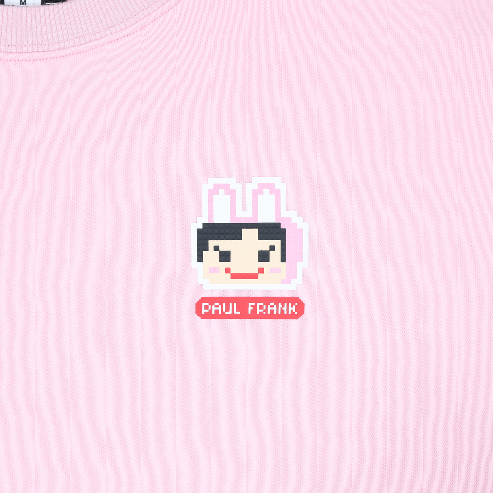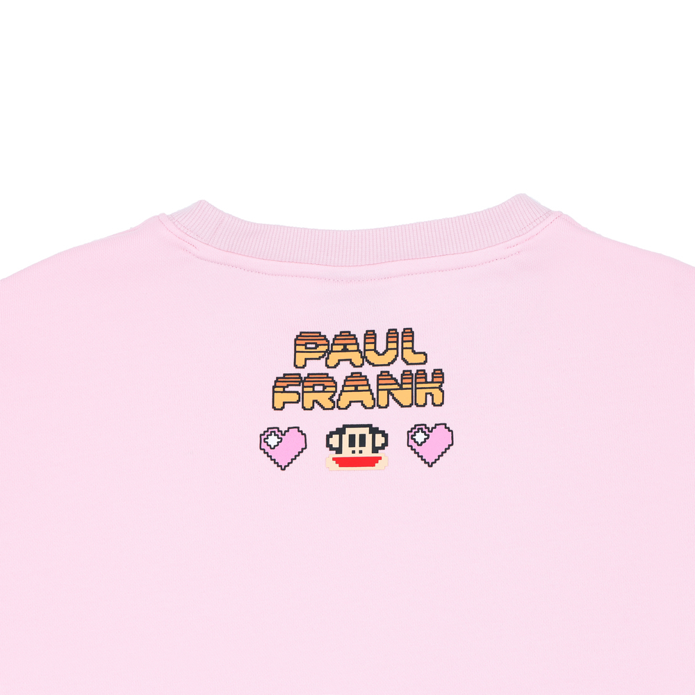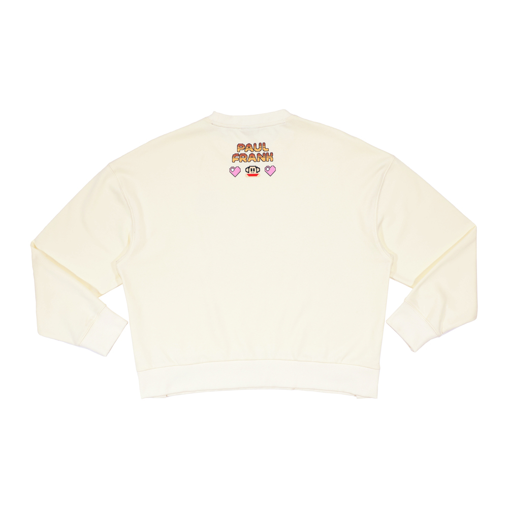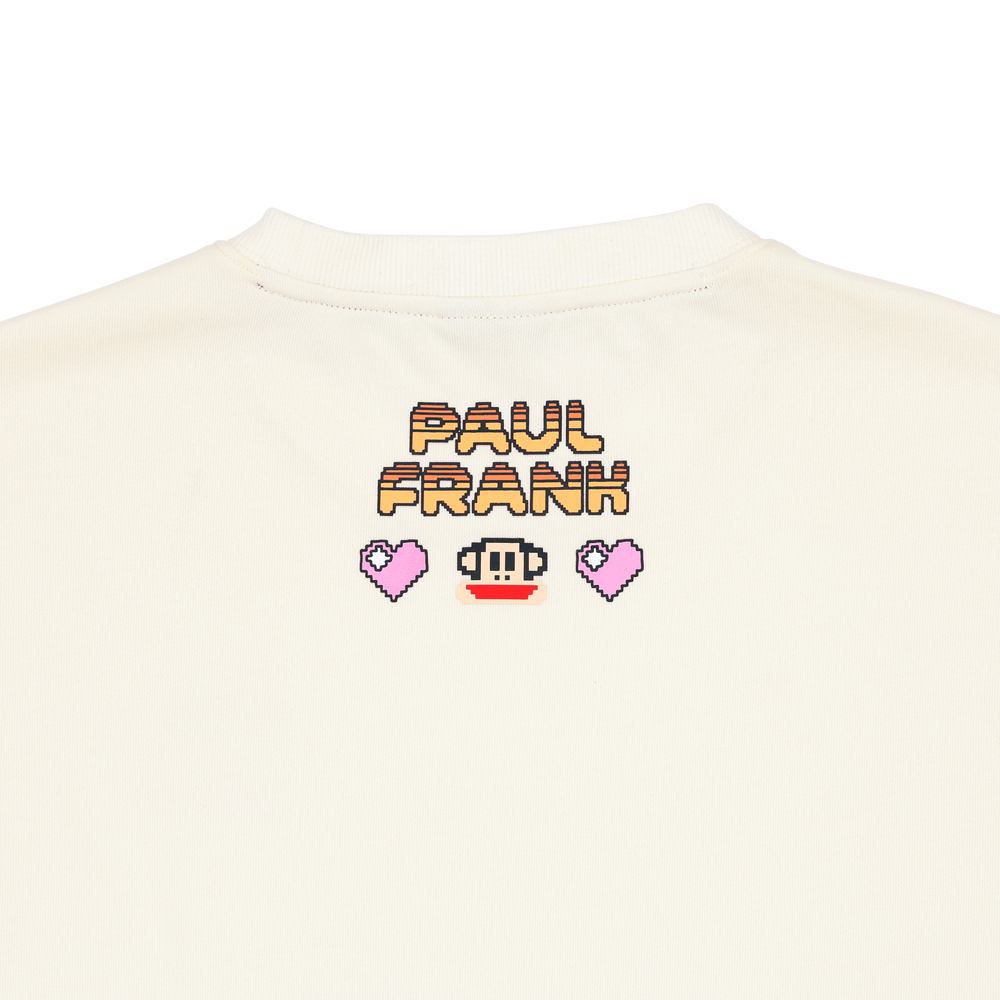短版寬鬆版型,使用毛圈面料,厚度適中不厚重。以 2-bit 像素遊戲風格為主題,正面印有 Bunny Girl 像素立體印花,背面則為 Julius 像素電玩圖案,整體設計復古又趣味。