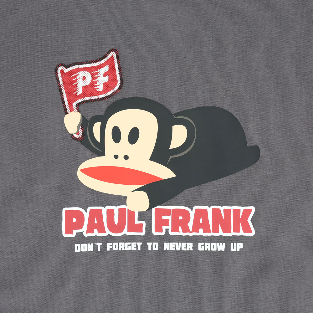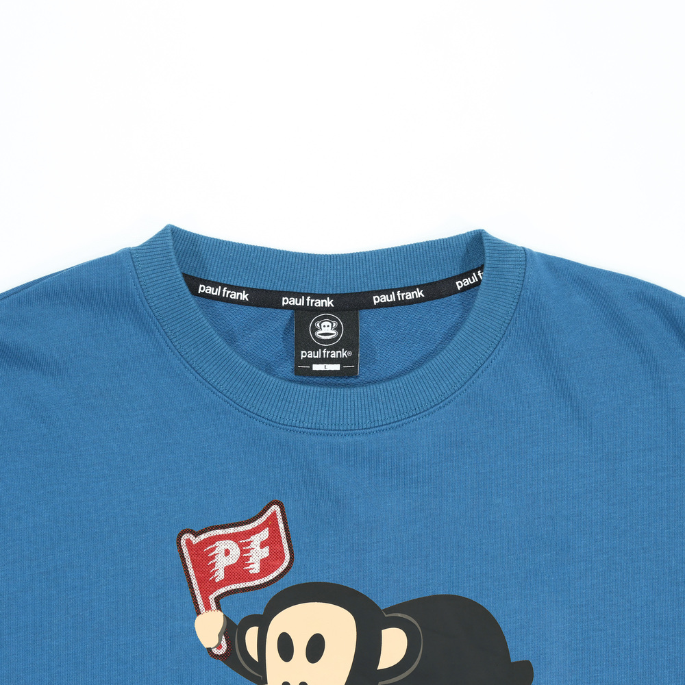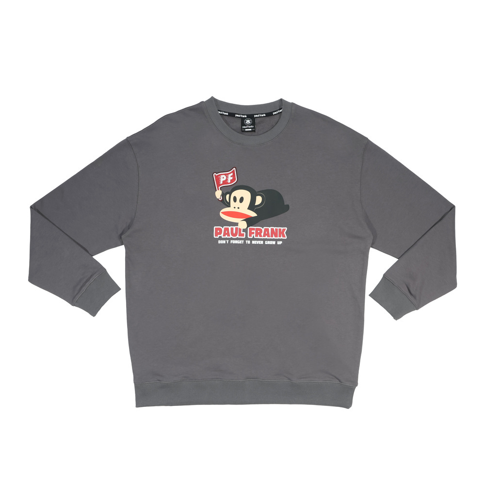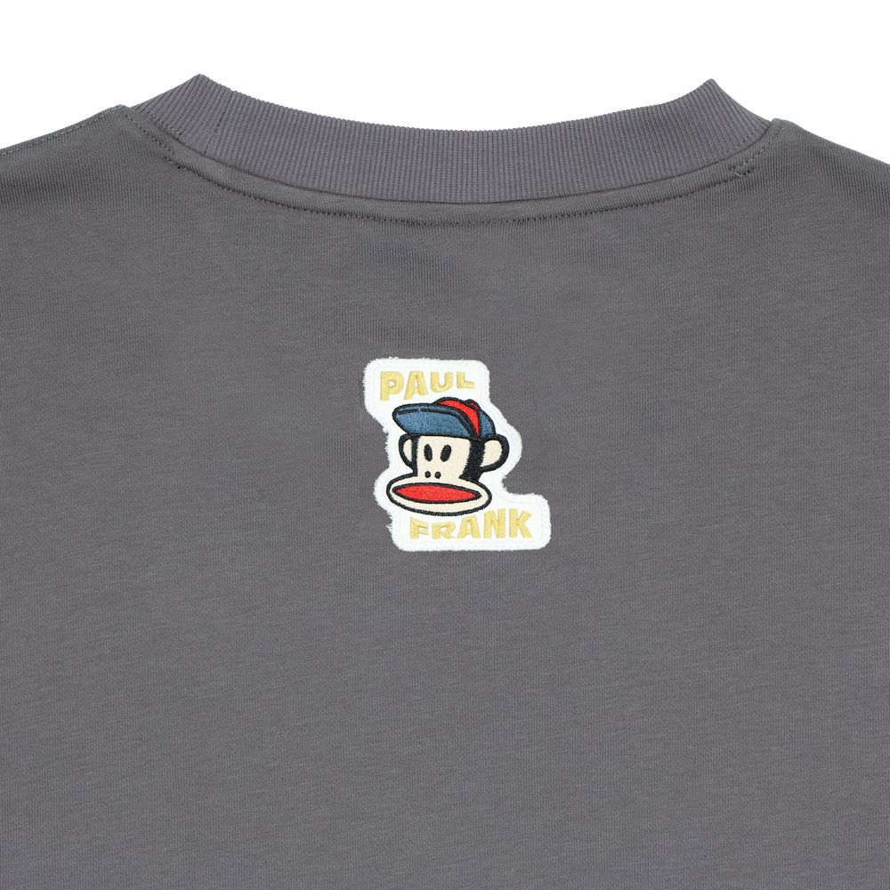 正面為趴臥姿勢的 Julius 印花,手中揮舞著採用特殊工藝製作的 PF 旗幟,呈現出一種慵懶卻又想努力的趣味氛圍。