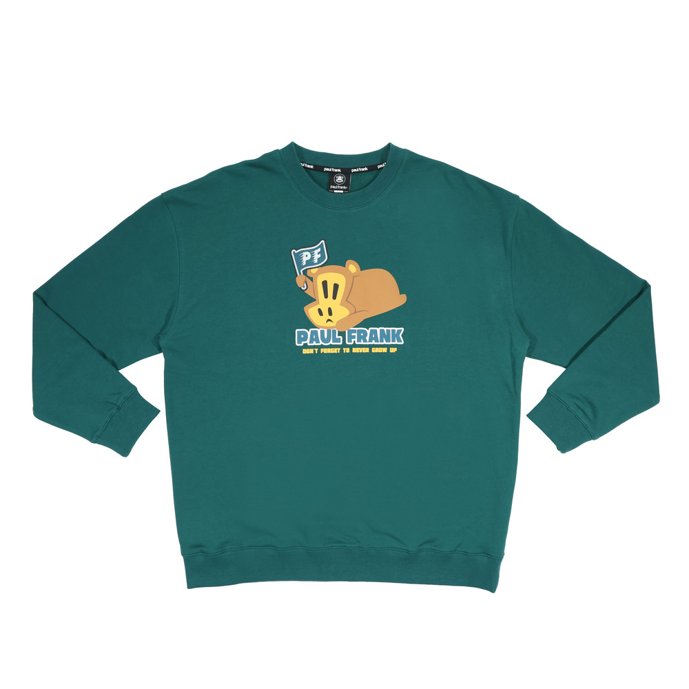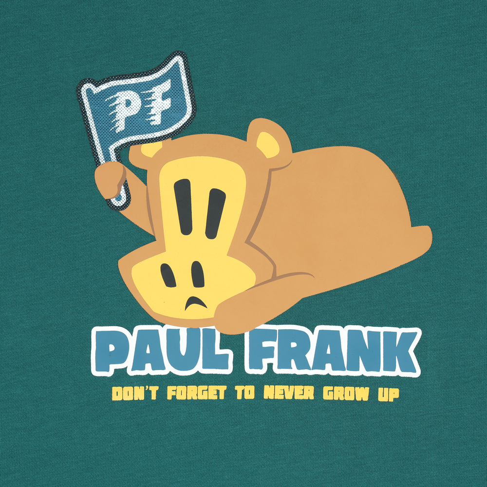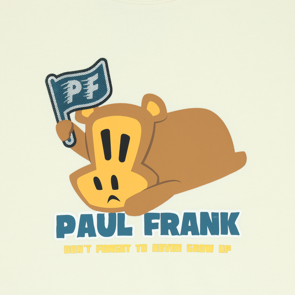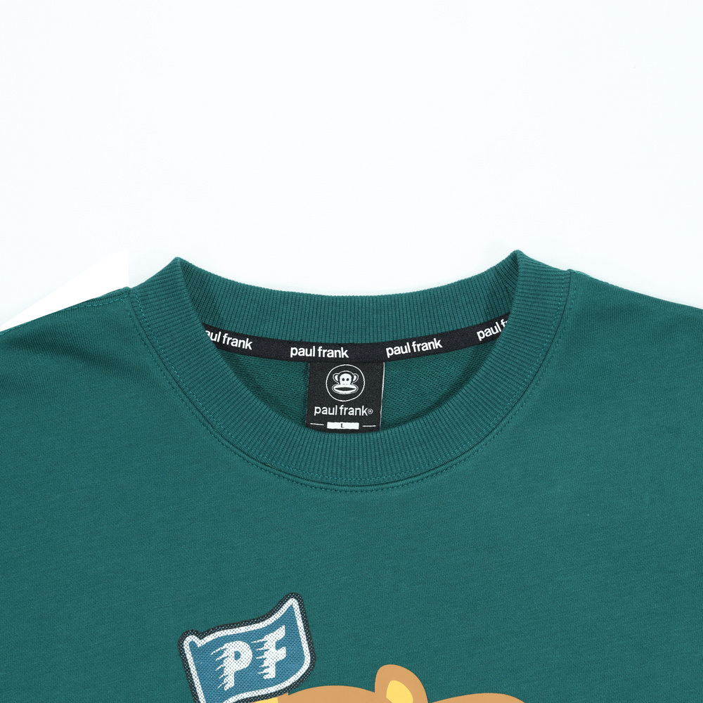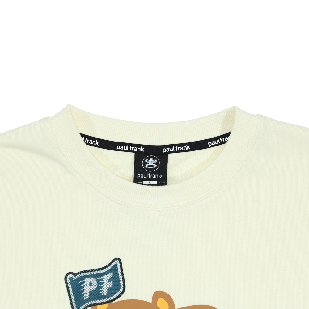 正面為趴臥姿勢的 Worry Bear 印花,手中揮舞著採用特殊工藝製作的 PF 旗幟,呈現出一種慵懶卻又想努力的趣味氛圍。