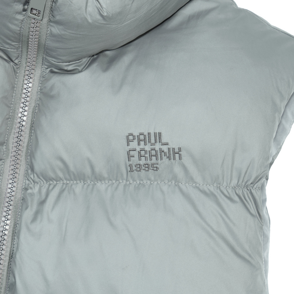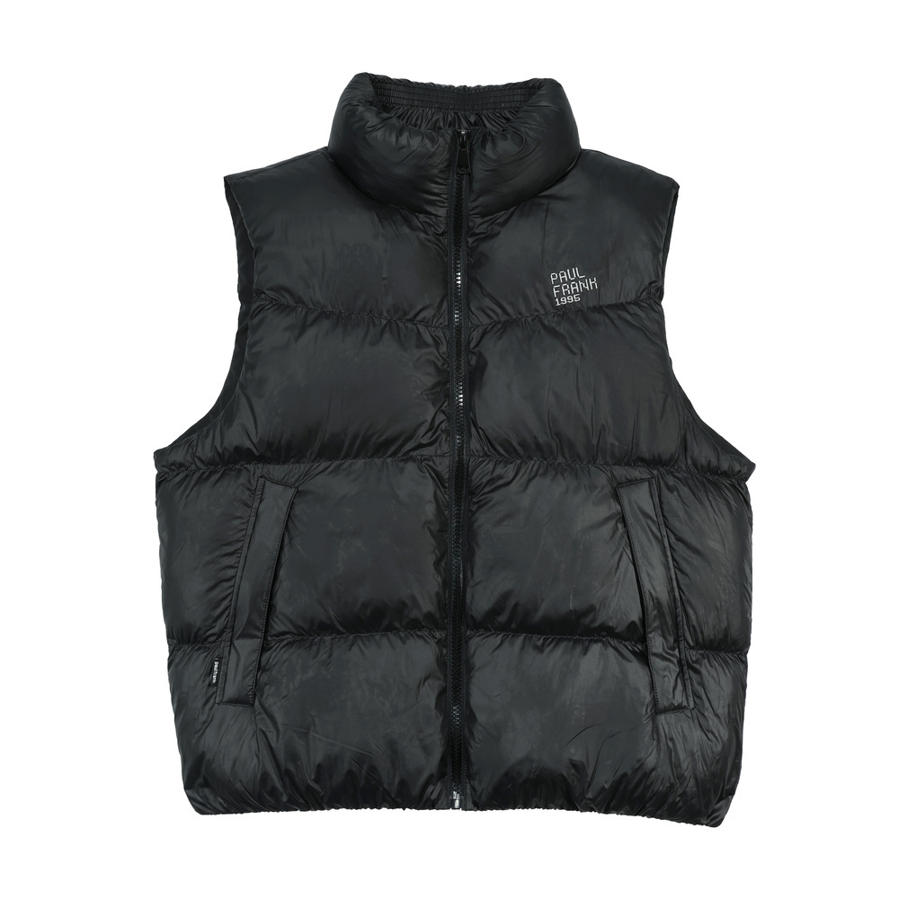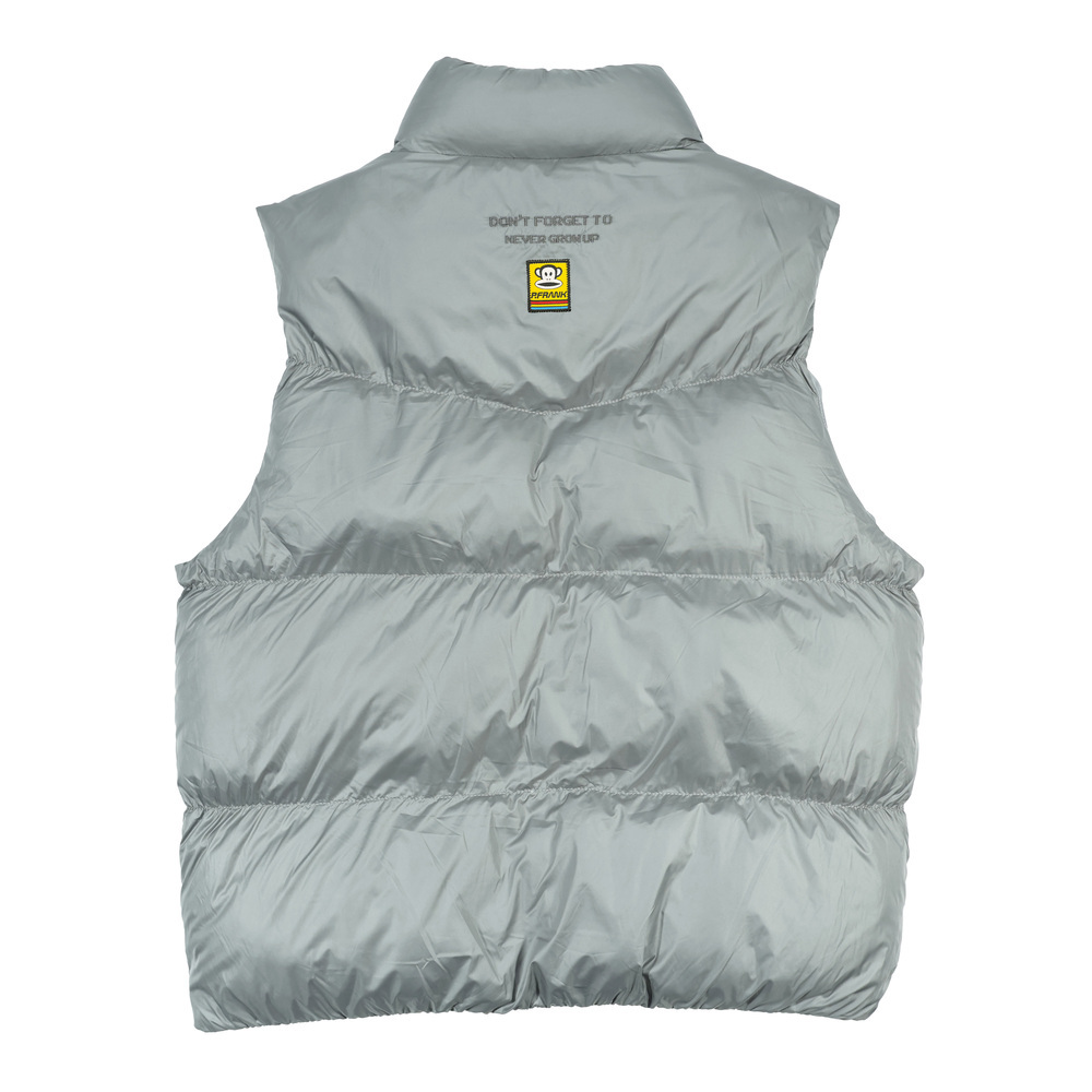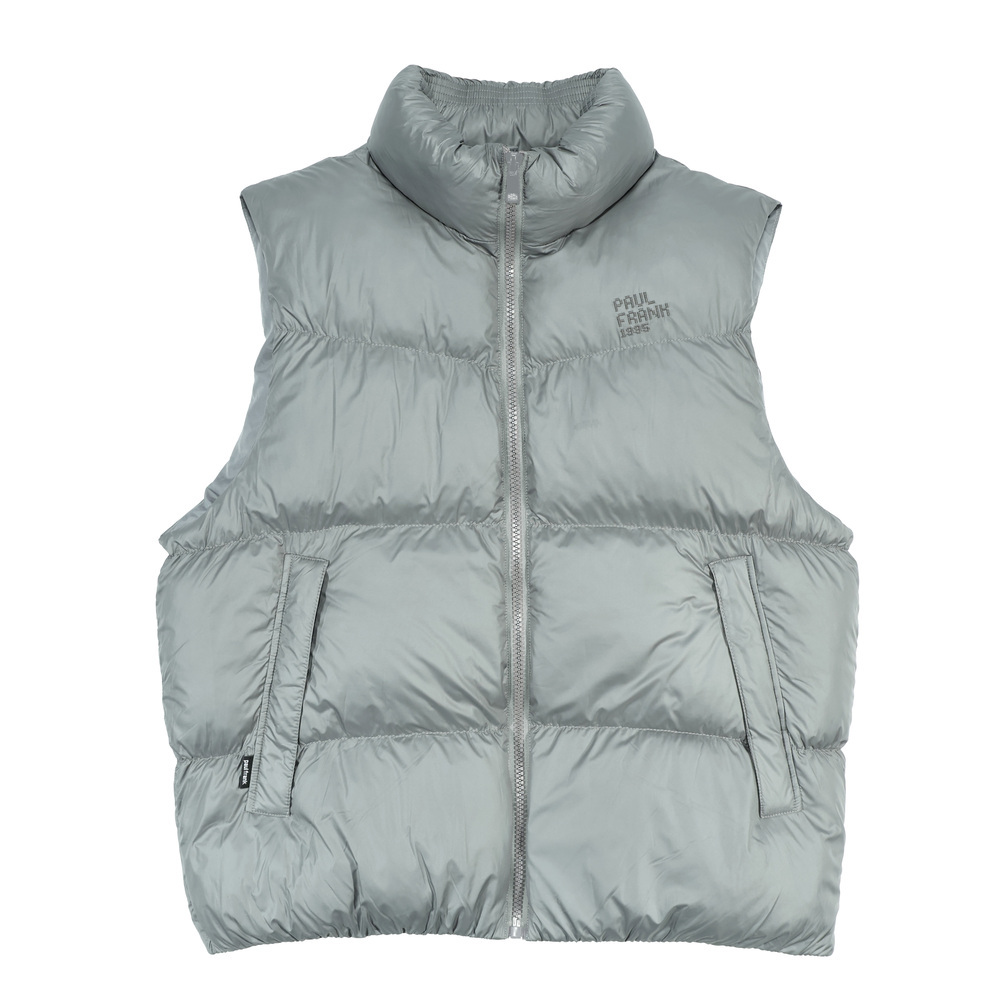 此款亮面充棉背心,面料亮眼且具備防潑水功能。