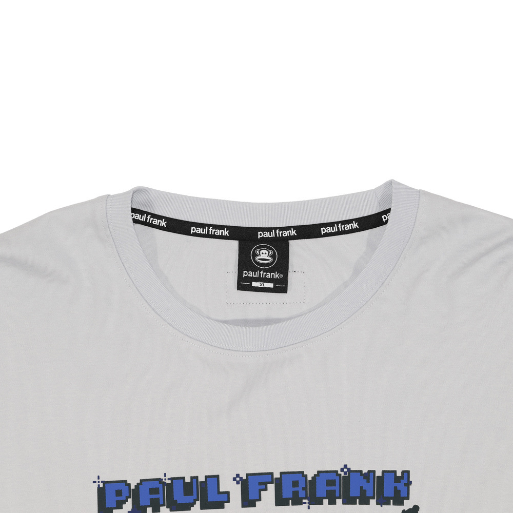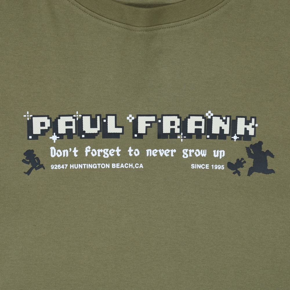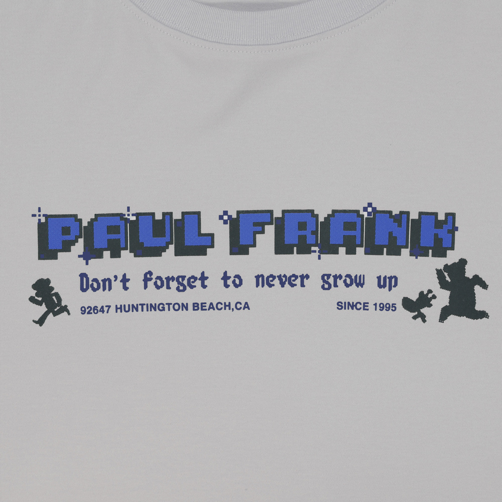 版型落肩寬鬆,胸前為PAUL FRANK 像素立體印花搭配角色奔跑剪影,袖口細節為Julius 電玩生命值印花,整體營造出滿滿的復古遊戲風格。