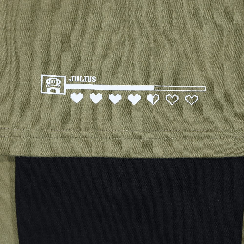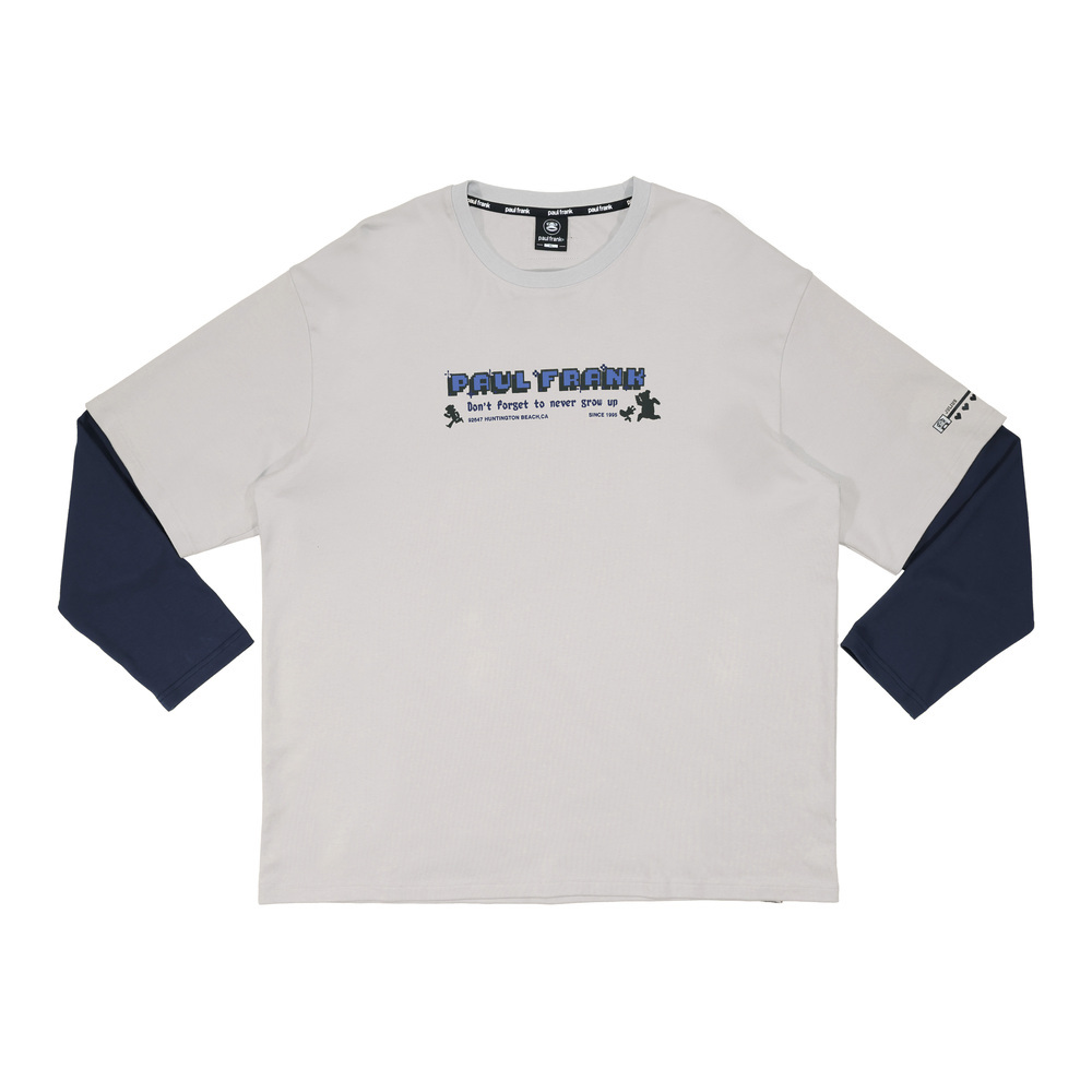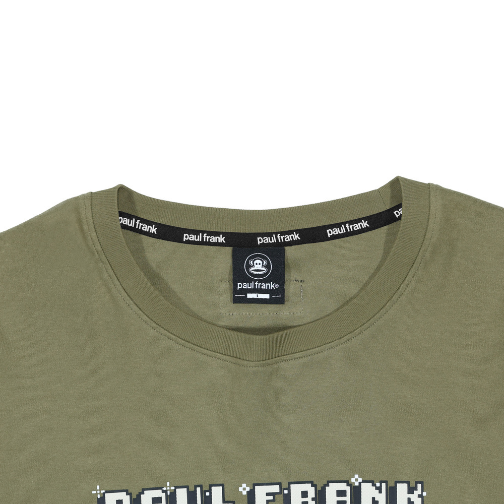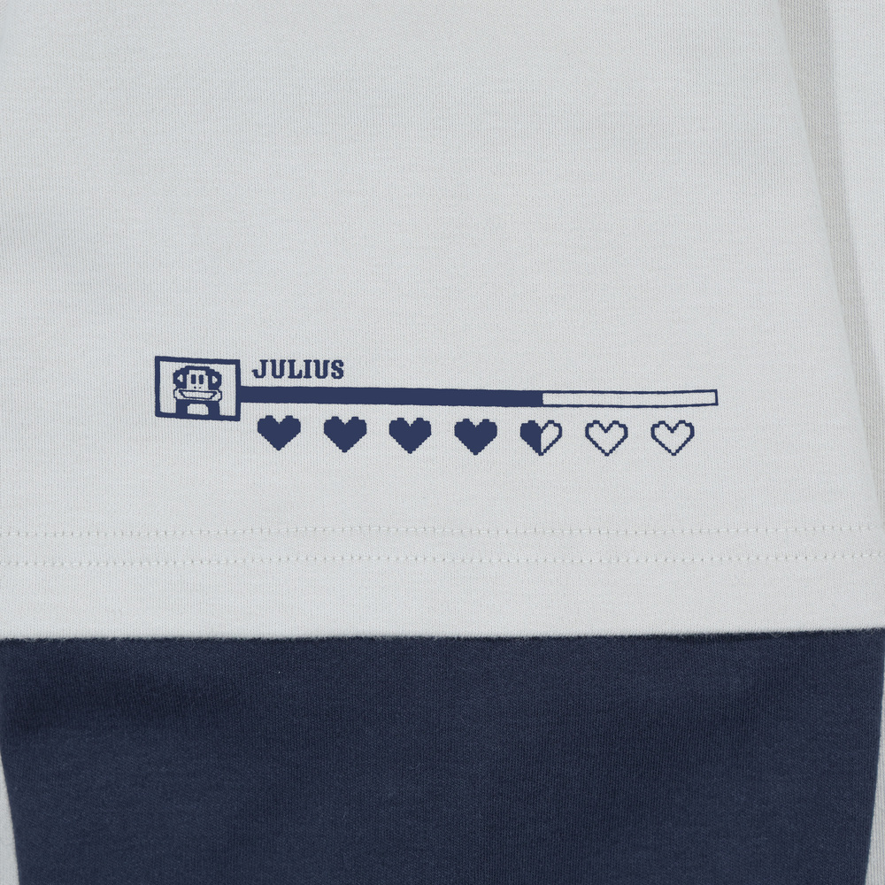 版型落肩寬鬆,胸前為PAUL FRANK 像素立體印花搭配角色奔跑剪影,袖口細節為Julius 電玩生命值印花,整體營造出滿滿的復古遊戲風格。