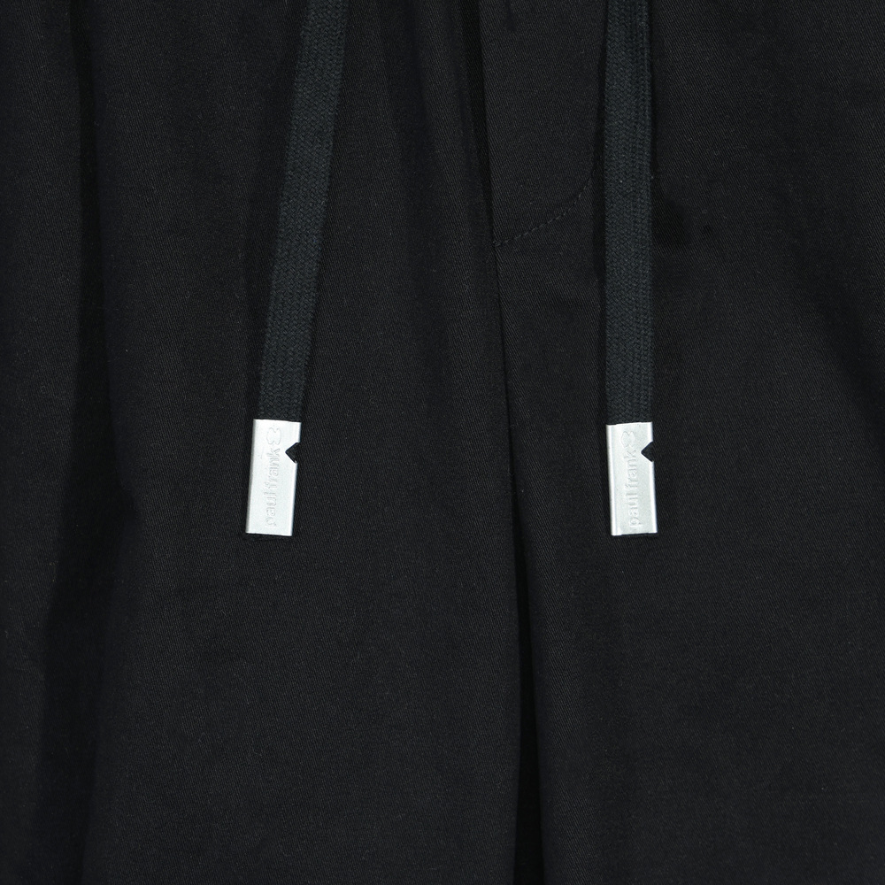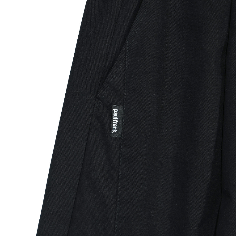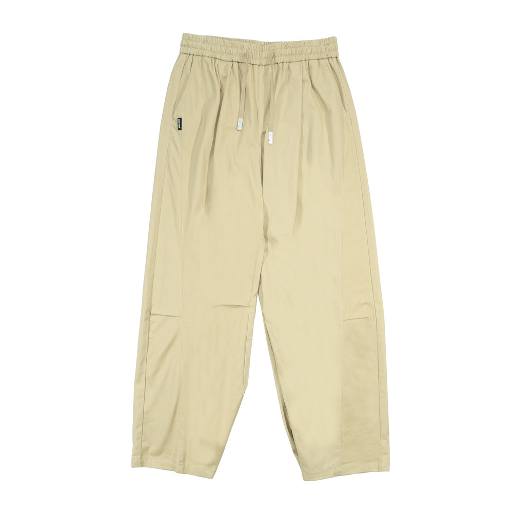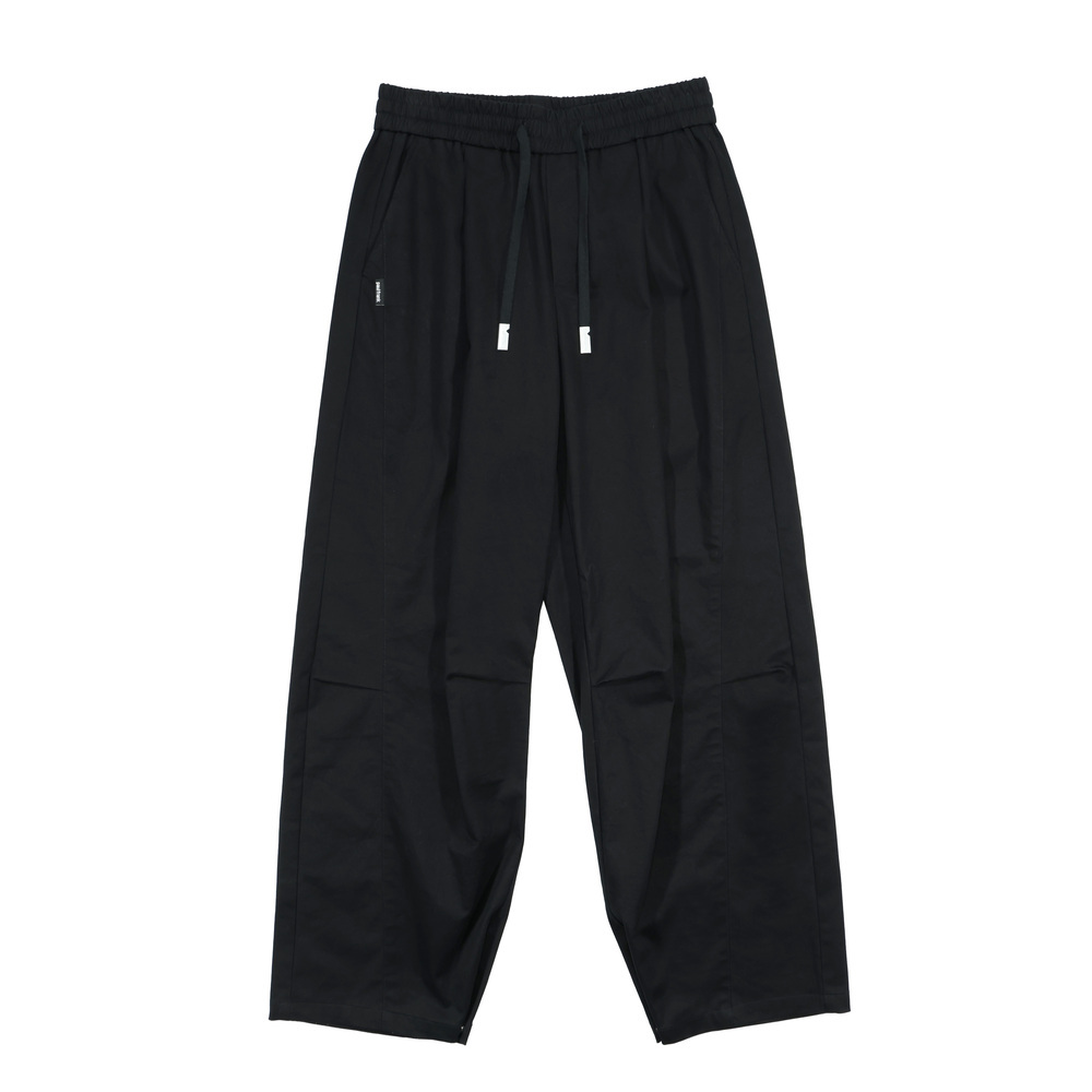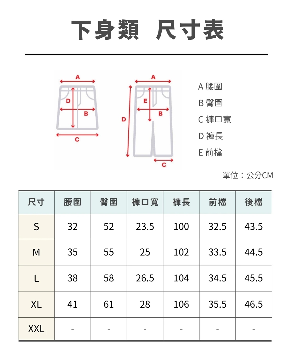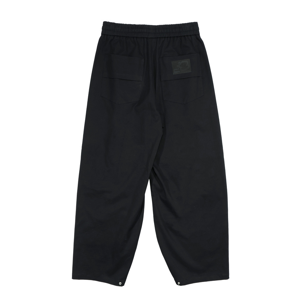 版型為彎刀廓型,側邊剪接打摺設計增加立體度,褲腳四合釦設計可自由調整褲型。