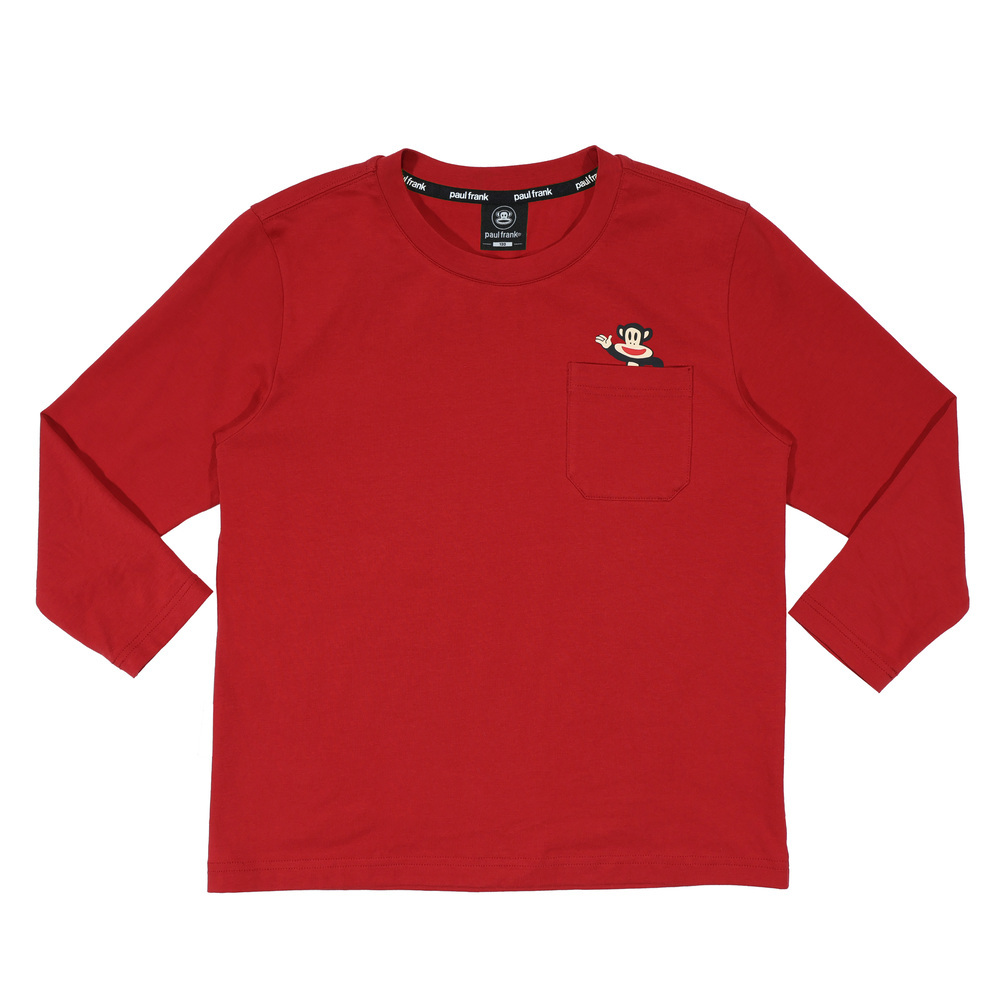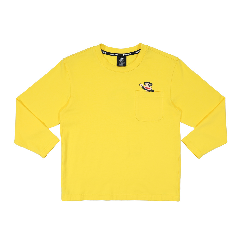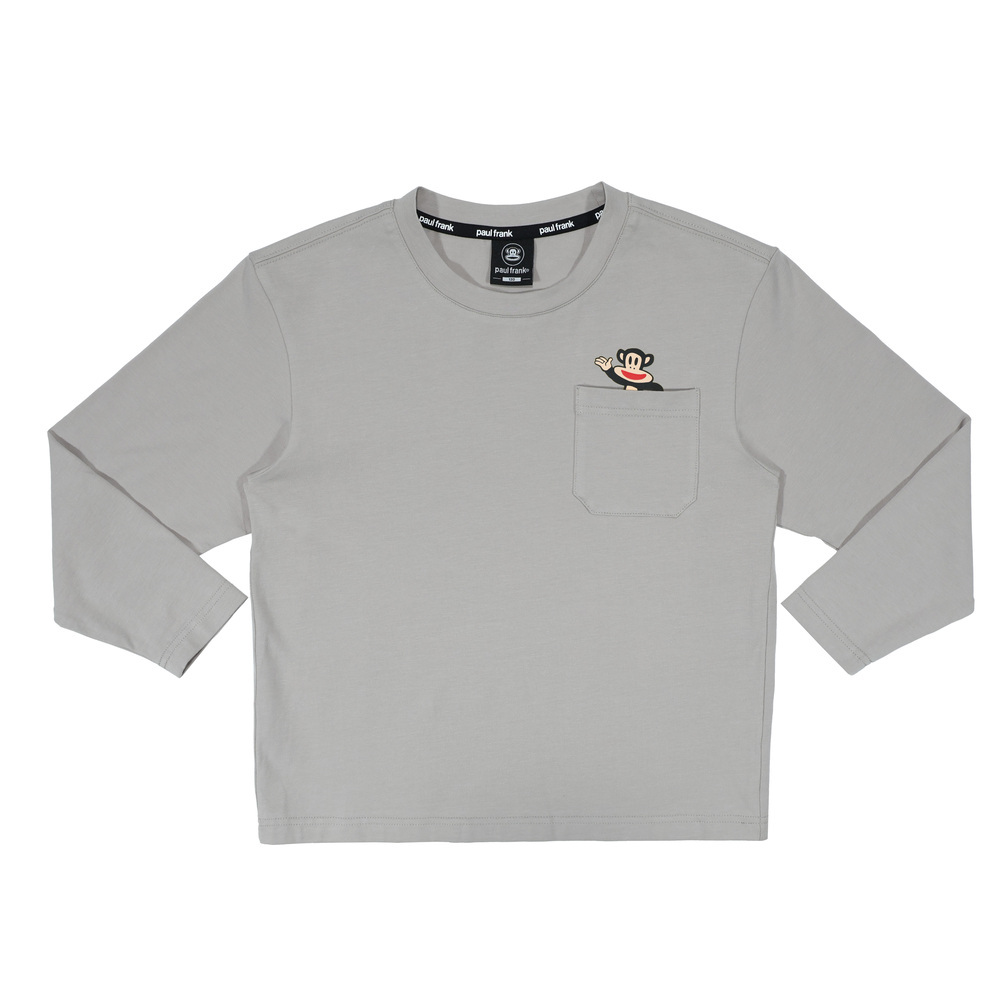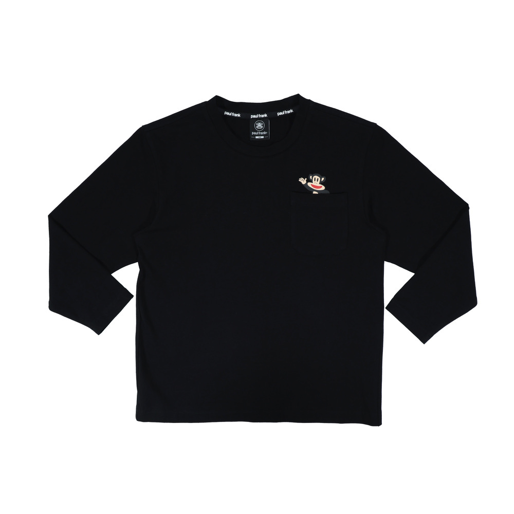此款薄長袖T恤,使用帶點彈性的薄面料,穿著舒適,左胸前口袋中露出的 Julius 招手印花與背面大圖 Julius 印花,展現出趣味朝氣風格。