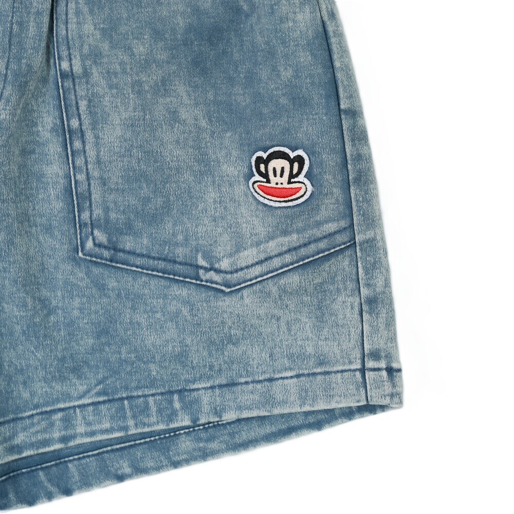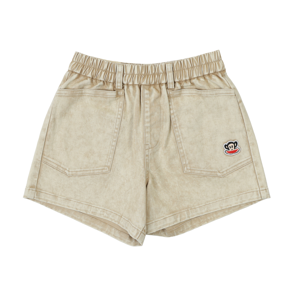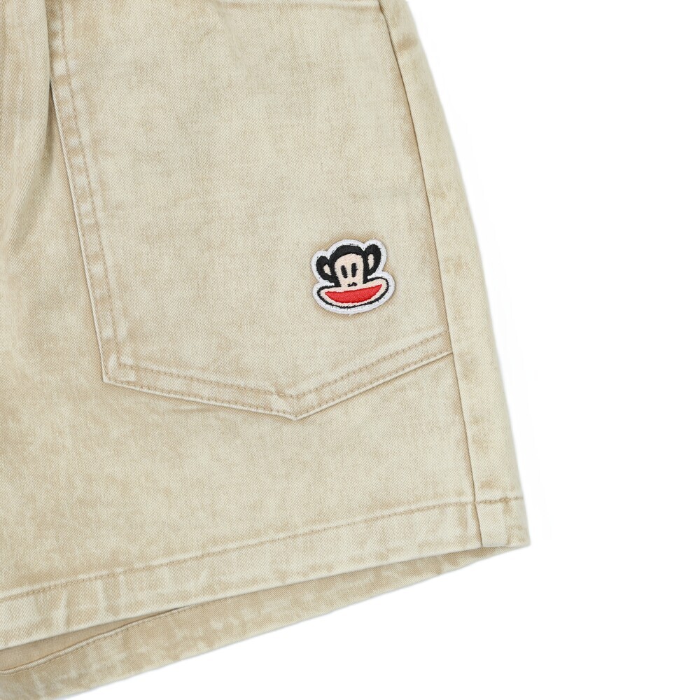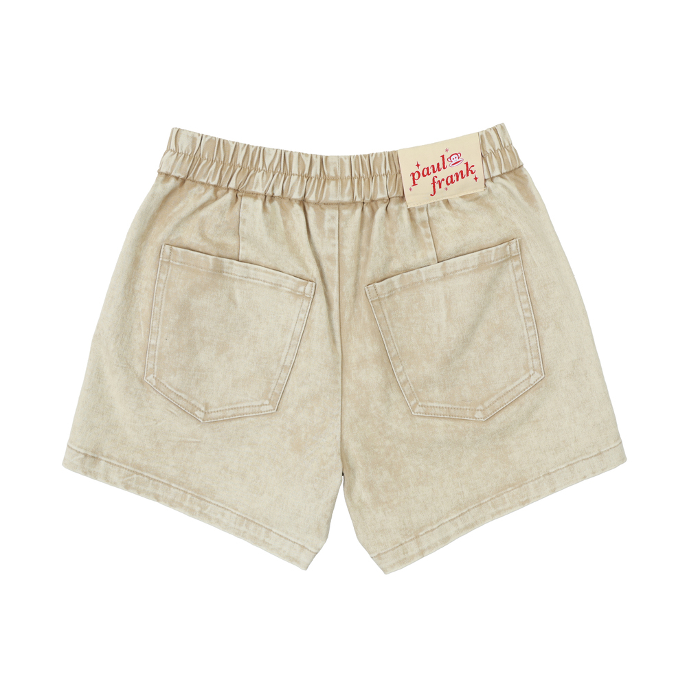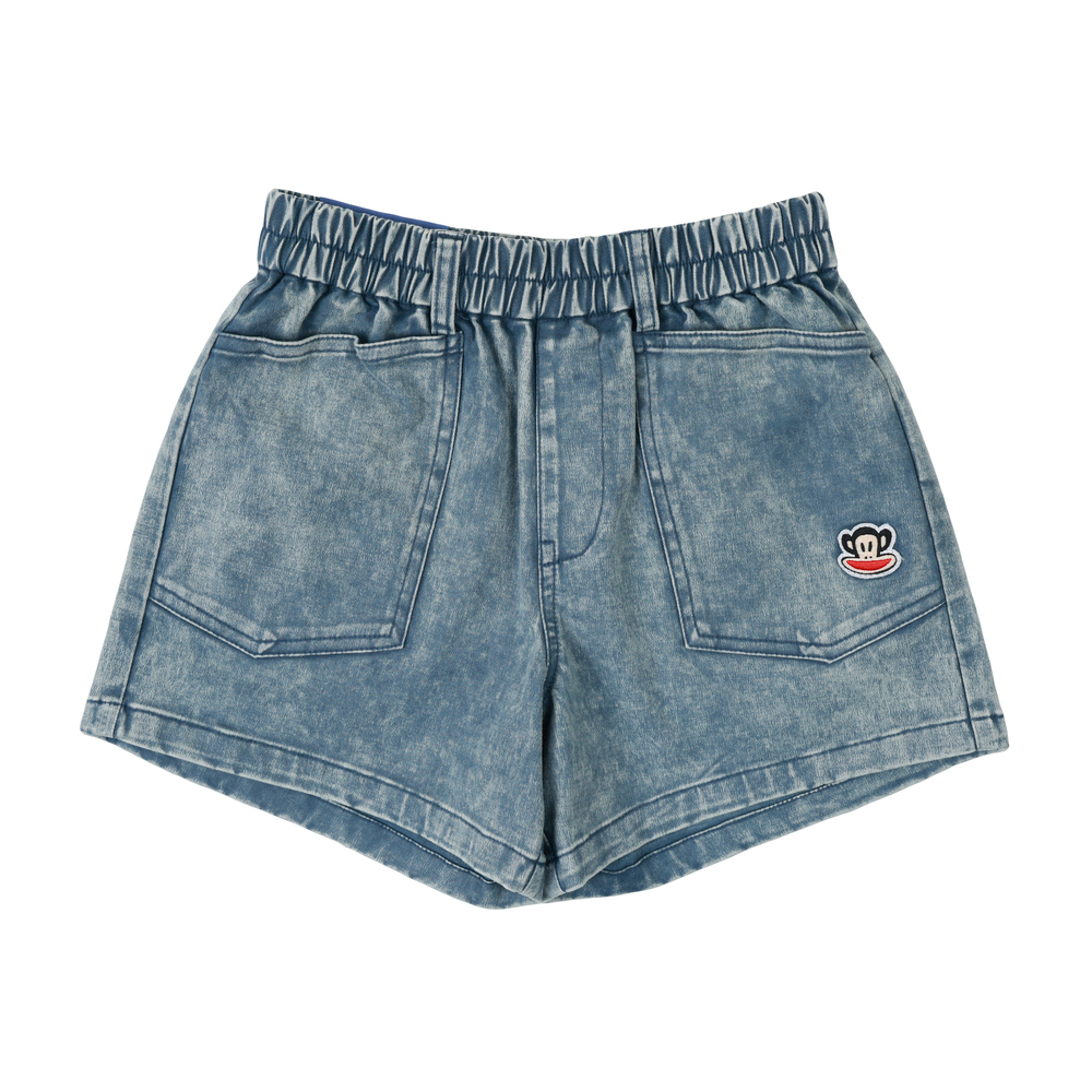 短褲搭配 Julius 塗鴉小標,後側腰頭加入糖果包裝造型織標,細節低調可愛,兼顧舒適度與趣味設計,適合日常與外出穿搭。